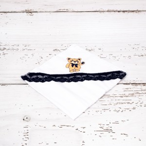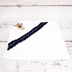 - Prosop cu capison pentru bebelus, folosit pentru stergerea bebelusului, imediat dupa botez. Prosopul are un ursulet pe capison cu o banda lata din dantela bleumarin la baza triunghiului. Dimensiuni: 78x74 cm.