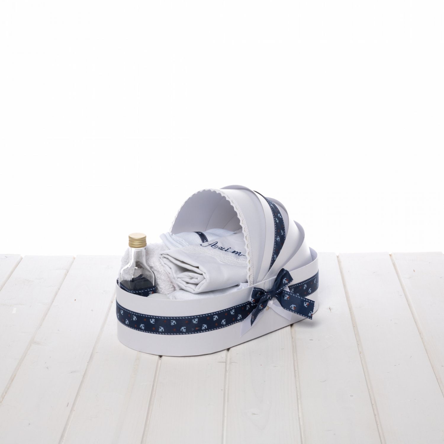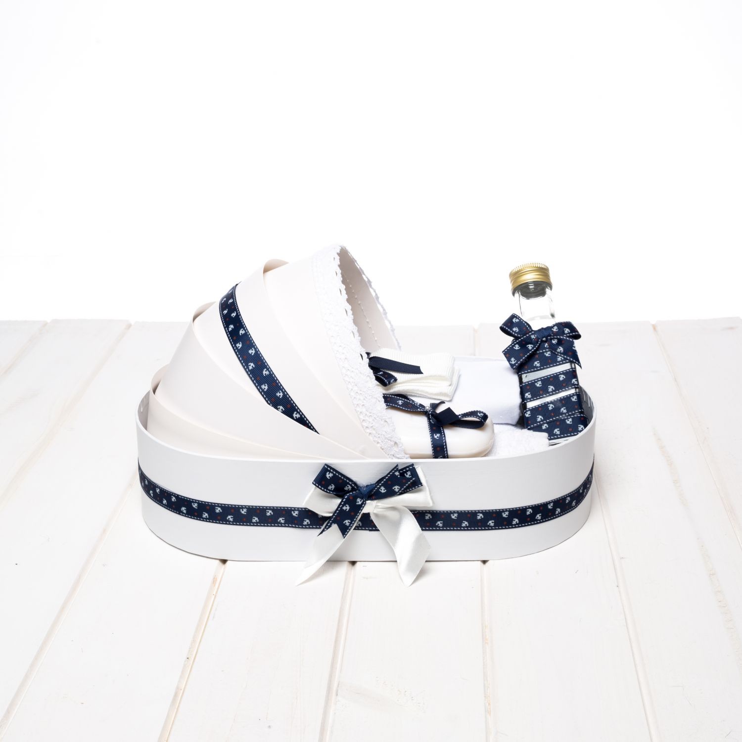 Cutia de carton in care sunt ambalate produsele se poate transforma intr-un mic carucior. Aceasta este decorata cu o banda bleumarin cu model ancora si doua fundite: una bleumarin cu acelasi model si una ivory din satin.