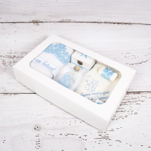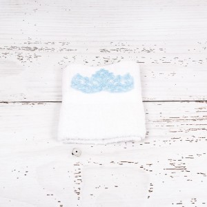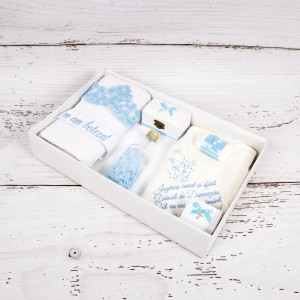 Transforma botezul finutului tau intr-o adevarata sarbatoare si, alaturi de un costum de haine in nuante de bleu, cumpara un trusou botez dantela bleu cu ingeras si versuri sugestive. Desenul si literele de mana sunt brodate manual.