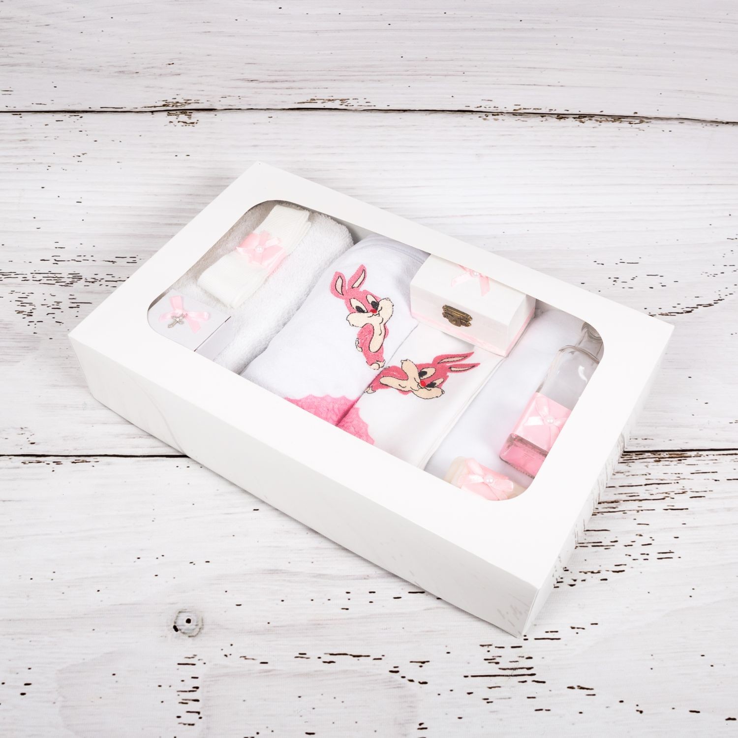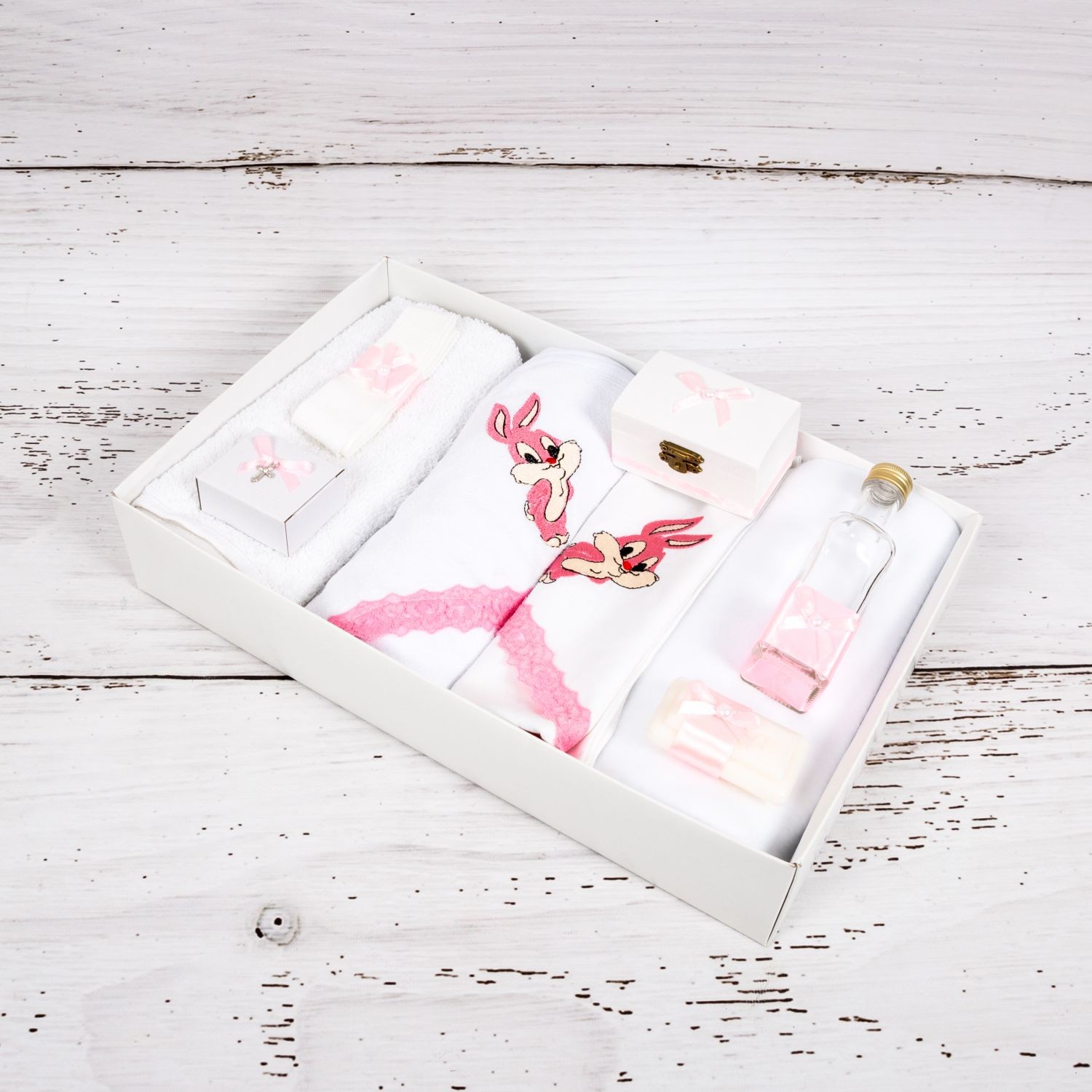 Trusoul de botez Iepuras roz pentru fetite este compus din urmatoarele piese esentiale: