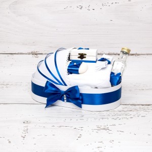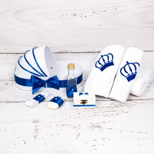 Pentru un botez in note regale, nasii unui baietel pot comanda un trusou botez cu model coroana albastra, ambalat intr-un landou elegant, cu decor panglica si funda albastra cu perlute.