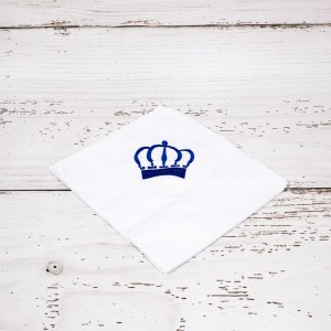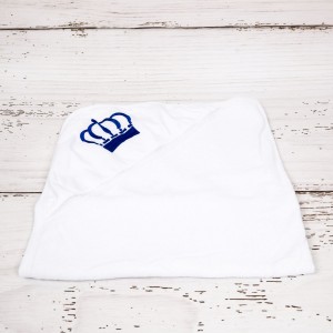 - Prosop cu capison pentru bebelus, folosit pentru scoaterea copilasului din cristelnita, imediat dupa botez. Prosopul are desenata o coronita albastra, iar la baza triunghiului un tiv din dantela. Dimensiuni: 76x73 cm.