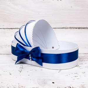 Cutia ovala tip landou este realizata din carton si acoperita cu saten albastru, panglica asortata si perlute. Cutia, sapunul, sticluta de mir si panglica sunt decorate manual in atelierul SelfEvents.ro.