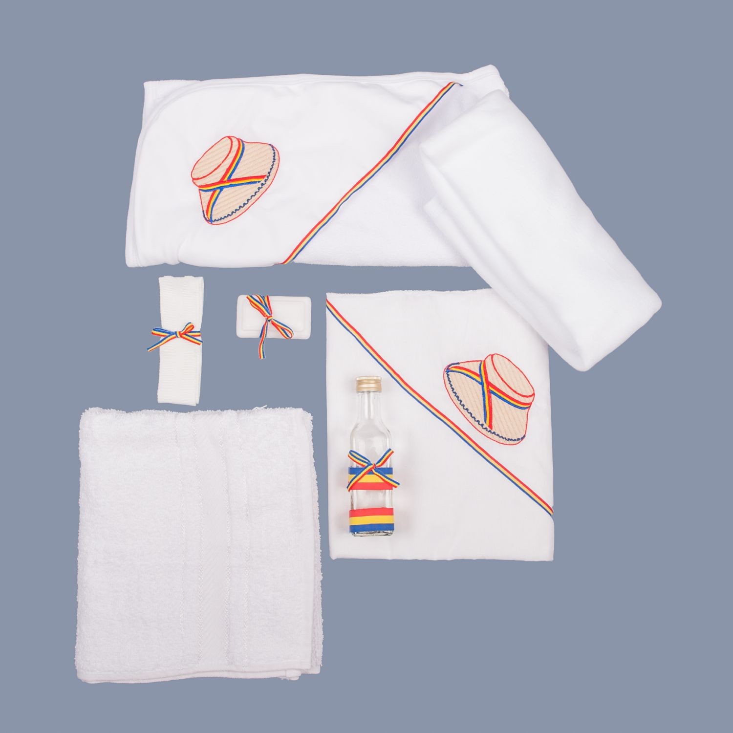 Fie ca esti nasa de baiat sau de fetita, un trusou botez cu model popular este perfect pentru ambele sexe. Daca parintii bebelusului organizeaza un botez in stil traditional, cu siguranta vor fi incantati de trusoul biserica cu model palarie si steag tricolor.
