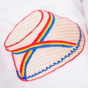 - Panza de mir din bumbac, cu model palarie si bordura tricolor la baza triunghiului. Pe aceasta este asezat copilul dupa botez. Dimensiuni: 104x97 cm.