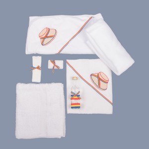 - Prosop cu capison pentru bebelus, folosit pentru stergerea copilasului scos din cristelnita, imediat dupa botez. Prosopul are o palarioara populara pe capison, iar la baza triunghiului un tiv cu steagul tricolor. Dimensiuni: 77x72 cm.
