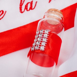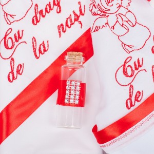 - sticluta de mir (decorata manual) cu banda rosie din satin si pietricele strass. In sticluta se pune ulei sfintit cu care este uns bebelusul la botez, dar si la prima sa baita. Sticluta are 8 cm inaltime si diametru de 3 cm.
