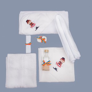 Trusoul de botez rustic contine sapte piese. Alaturi de cele doua prosoape pentru preot si bebelus, acesta este completat si cu alte accesorii necesare pentru cel mic.