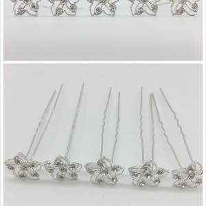 Acele de par model floricele argintii cu cristale sunt acele accesorii mireasa destinate pentru a sustine orice coafura simpla sau sofisticata, de la un coc chignon la o coafura lejera.
