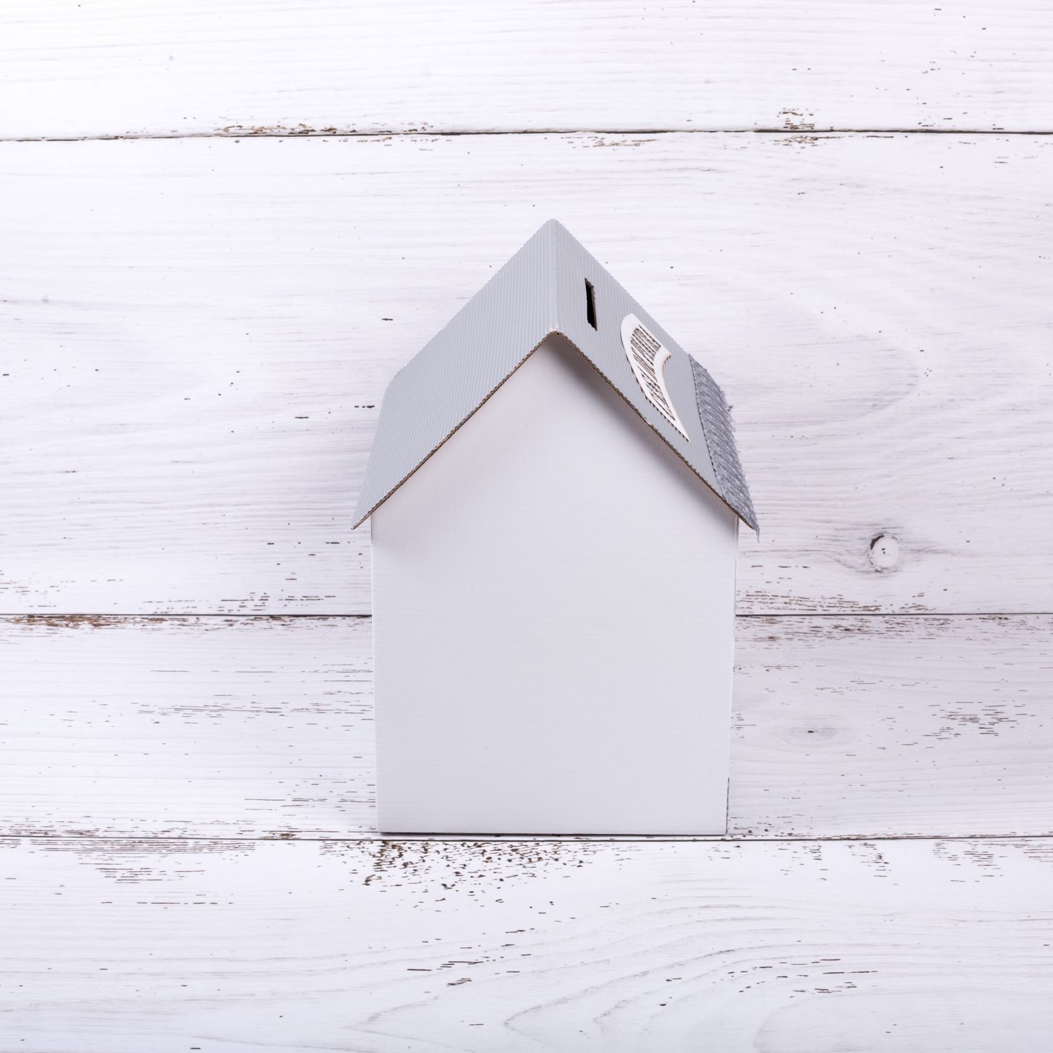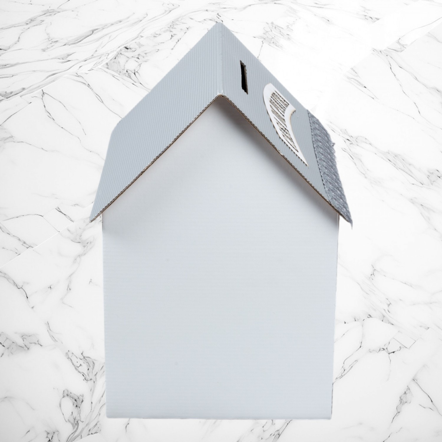 Casuta este alba, iar acoperisul de culoare argintie. Pe acoperis este lipit traditionalul mesaj "Casa de piatra".