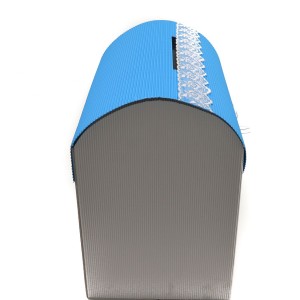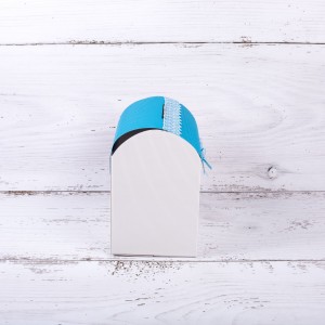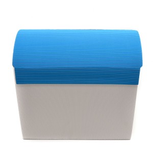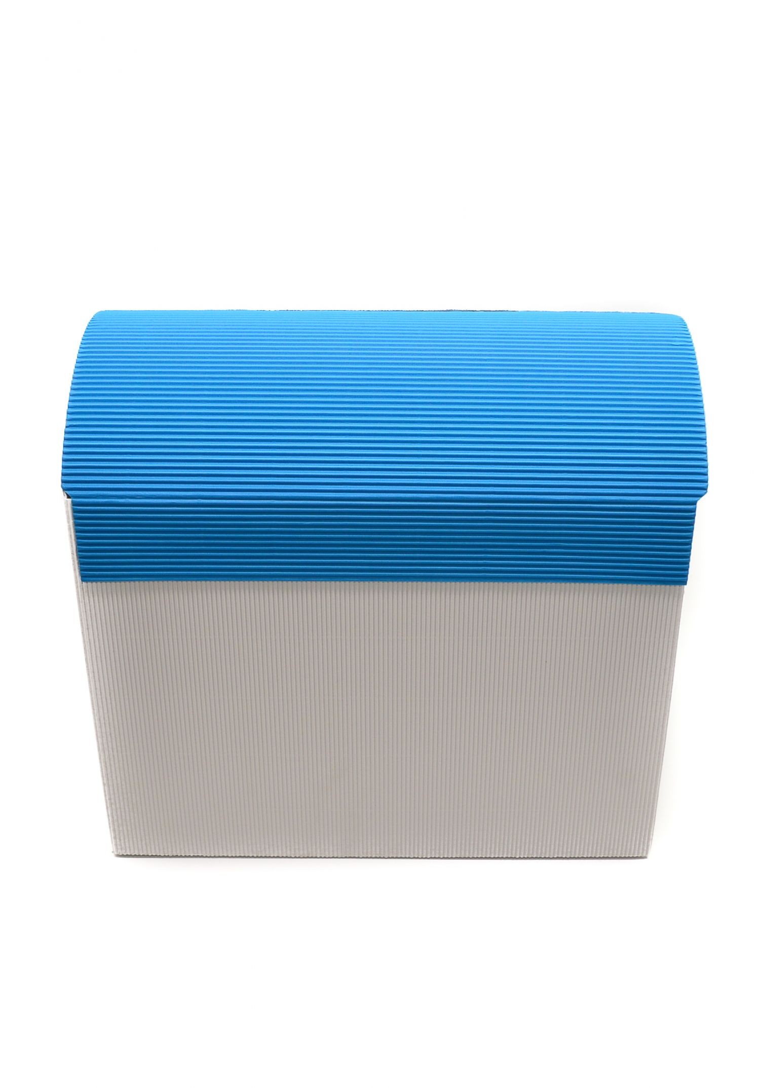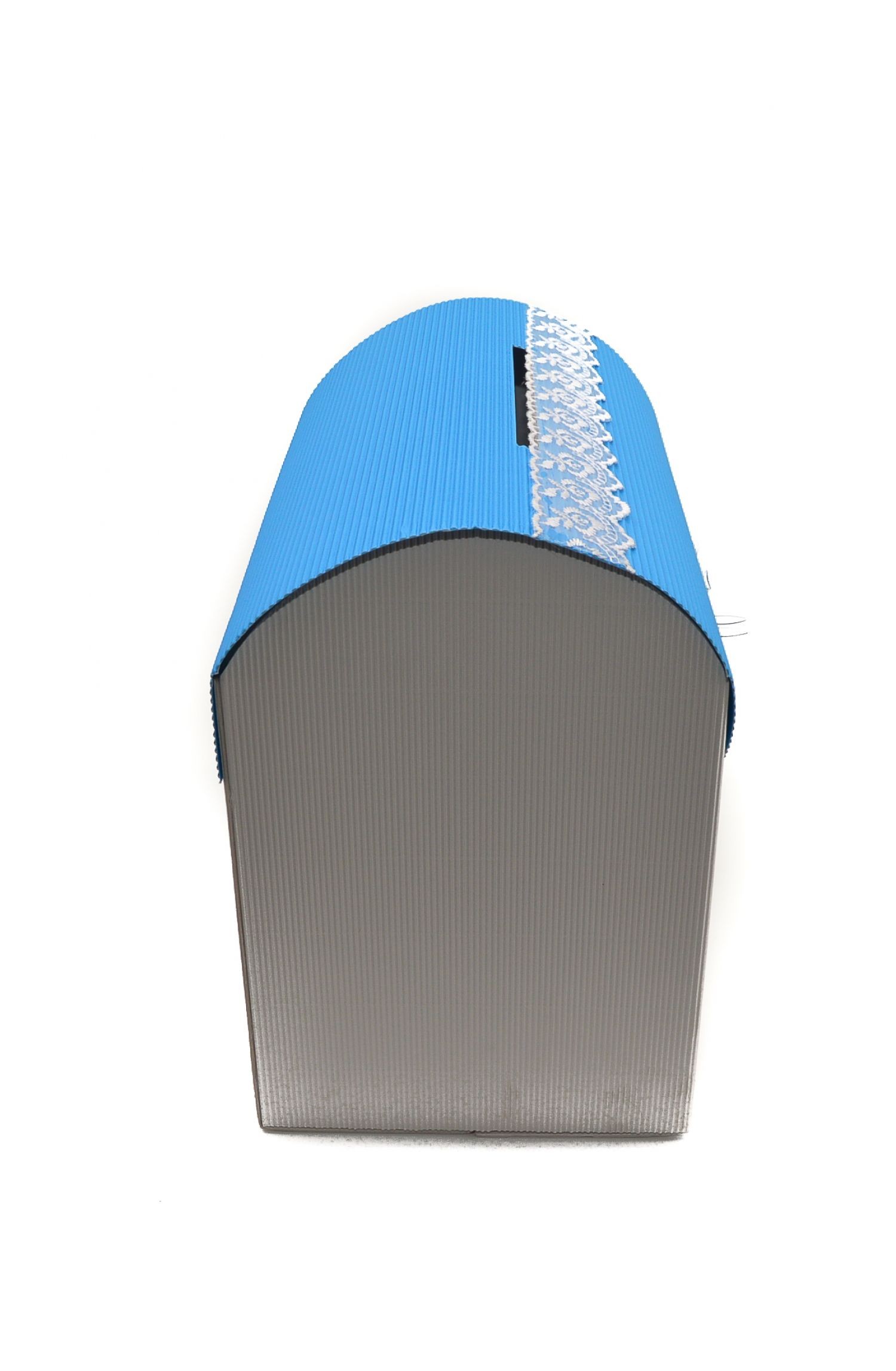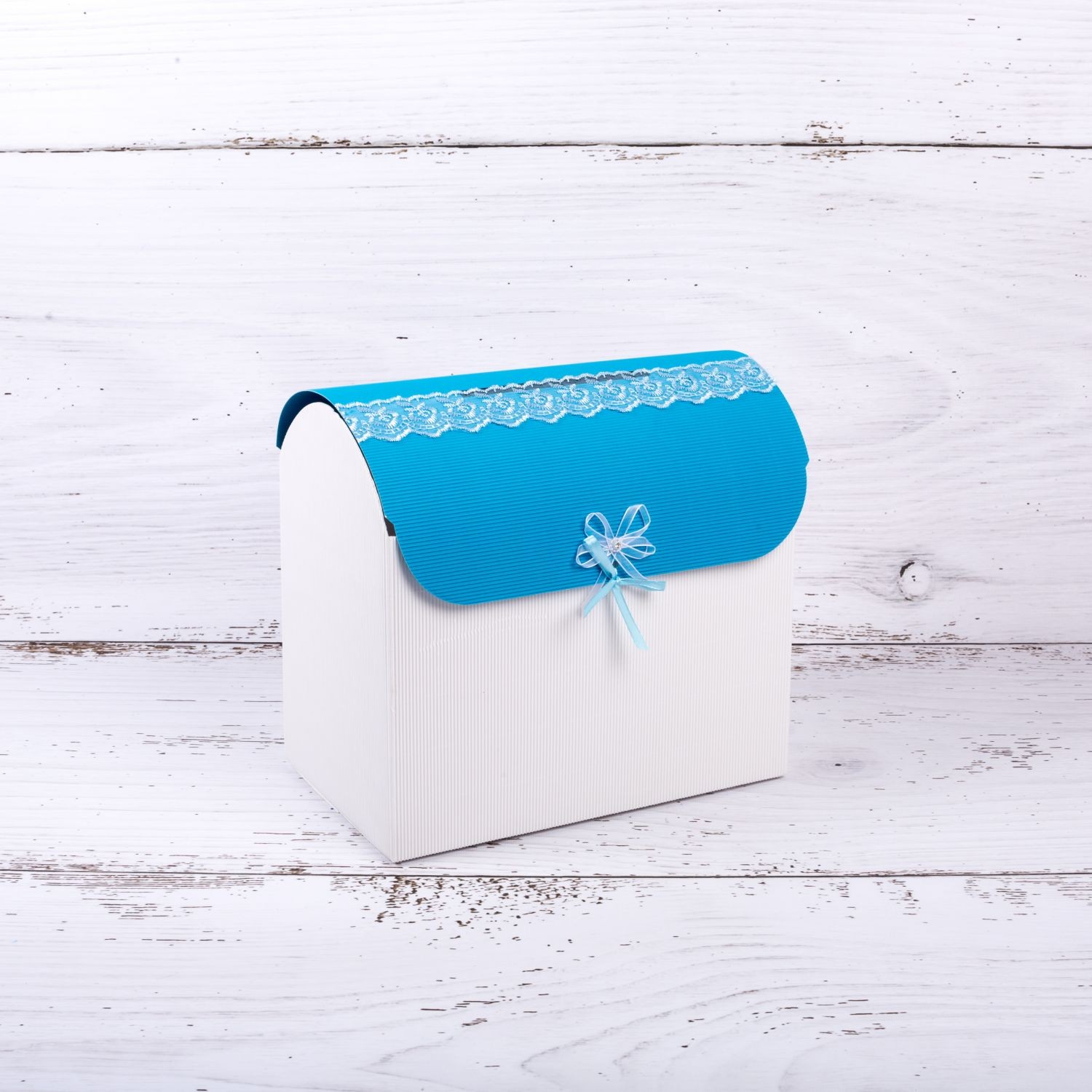 Cutie de dar in forma de cufar, realizata din carton ondulat alb cu partea superioara albastra.
