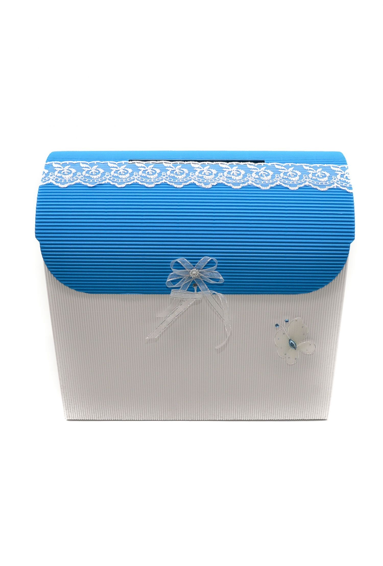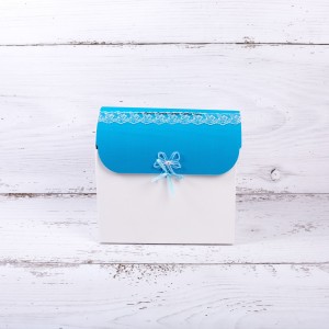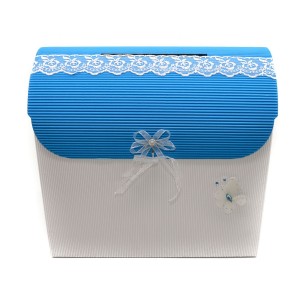 Acest accesoriu de nunta clasic folosit pentru strangerea plicurilor de bani are lipita o banda din dantela alba, fundite bleu din organza si fluturas alb din material textil.