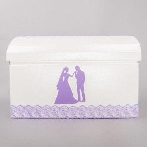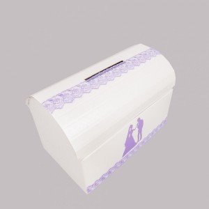 Casuta de dar cufar este decorata cu o banda lata din dantela lila, dar si cu o imagine a mirilor de aceeasi culoare.