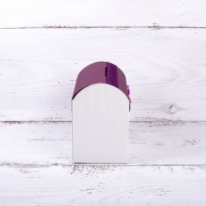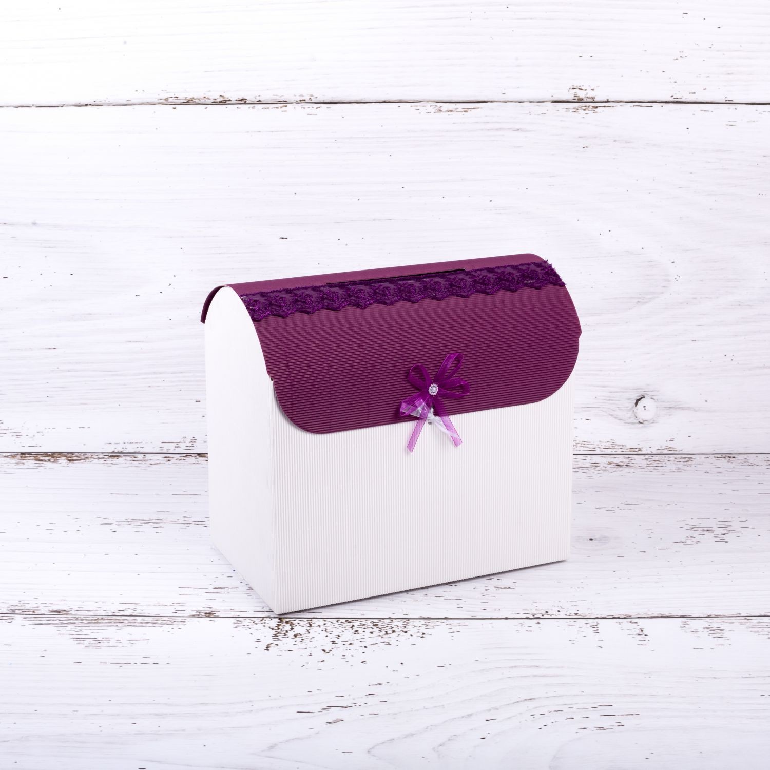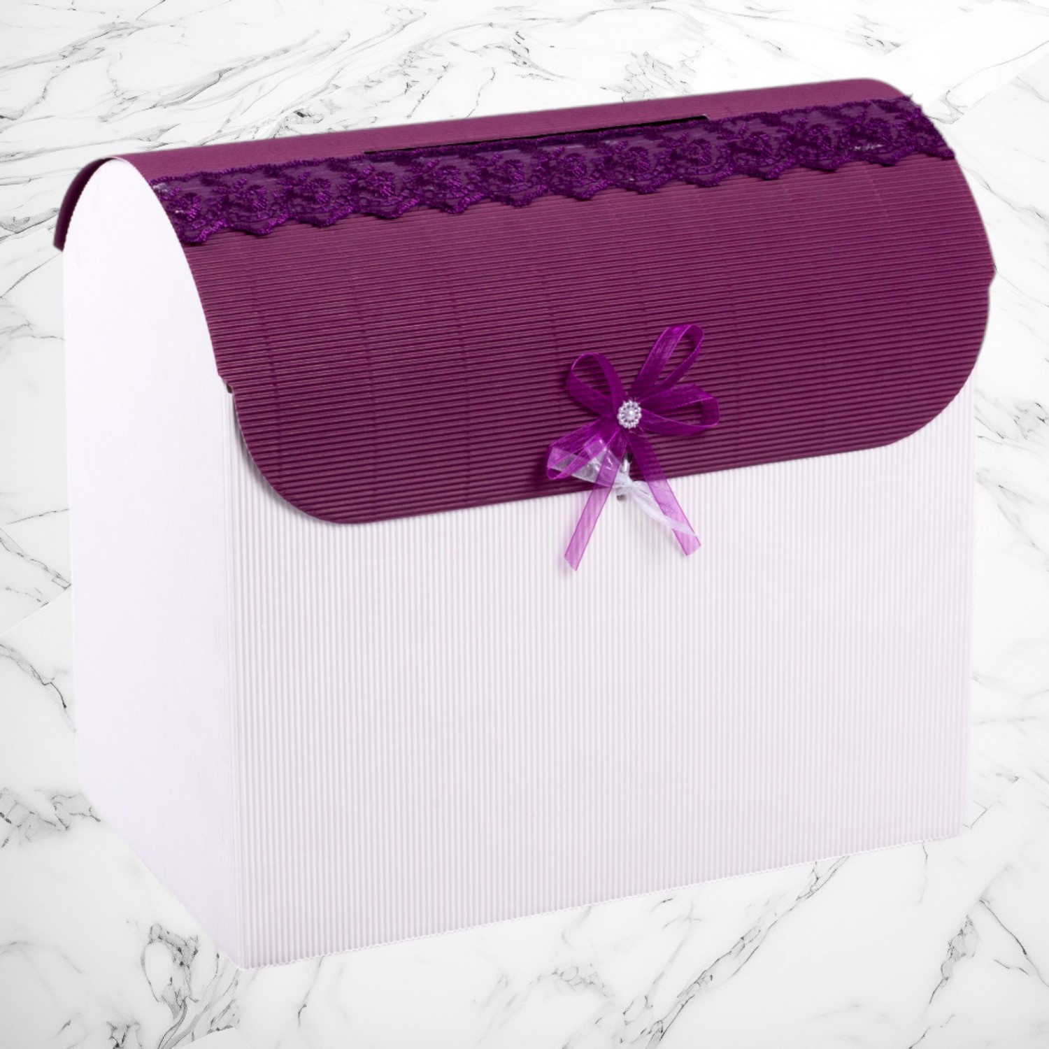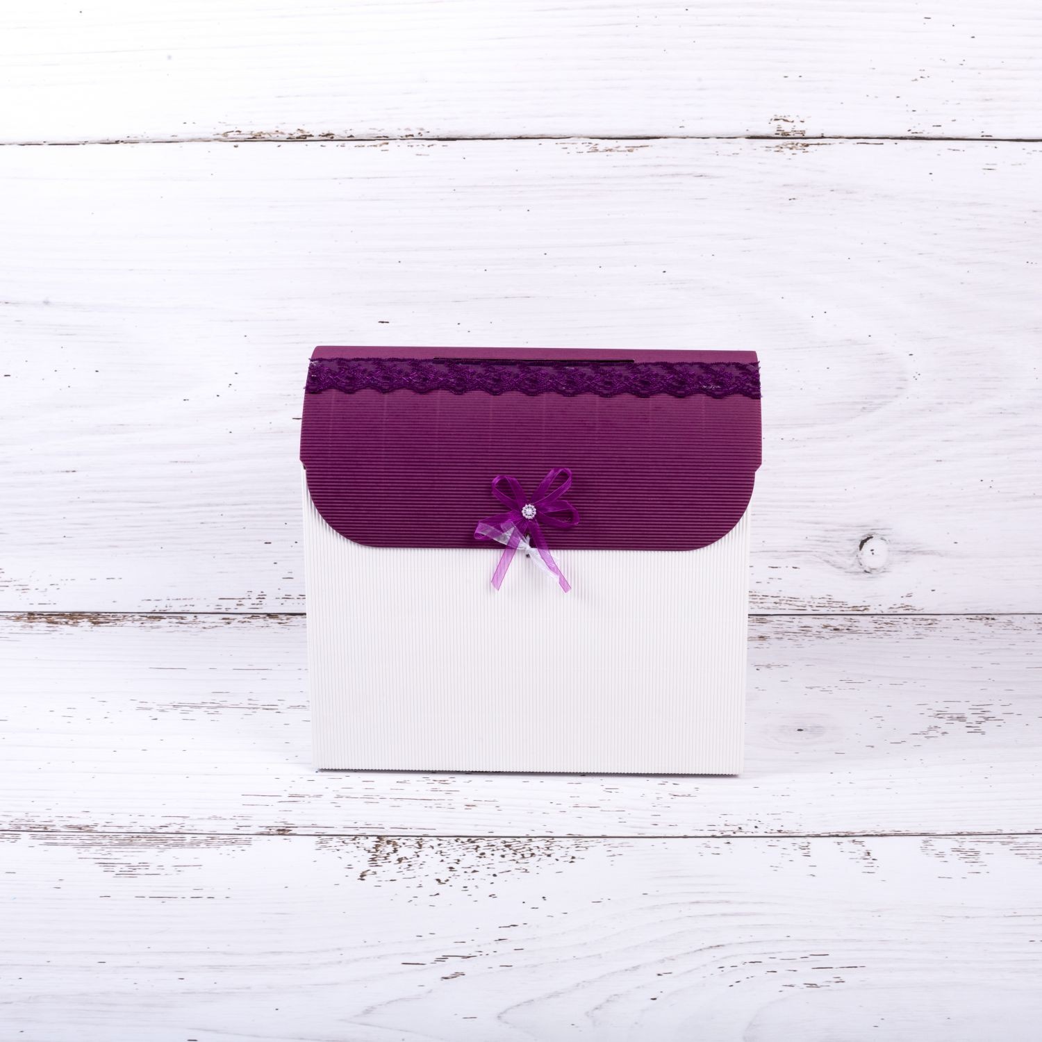 Cufarul de dar cu capac mov este potrivit pentru nuntile cu maxim 125 invitati. Acesta este realizat din carton ondulat si decorat cu dantela si fundita mov.
