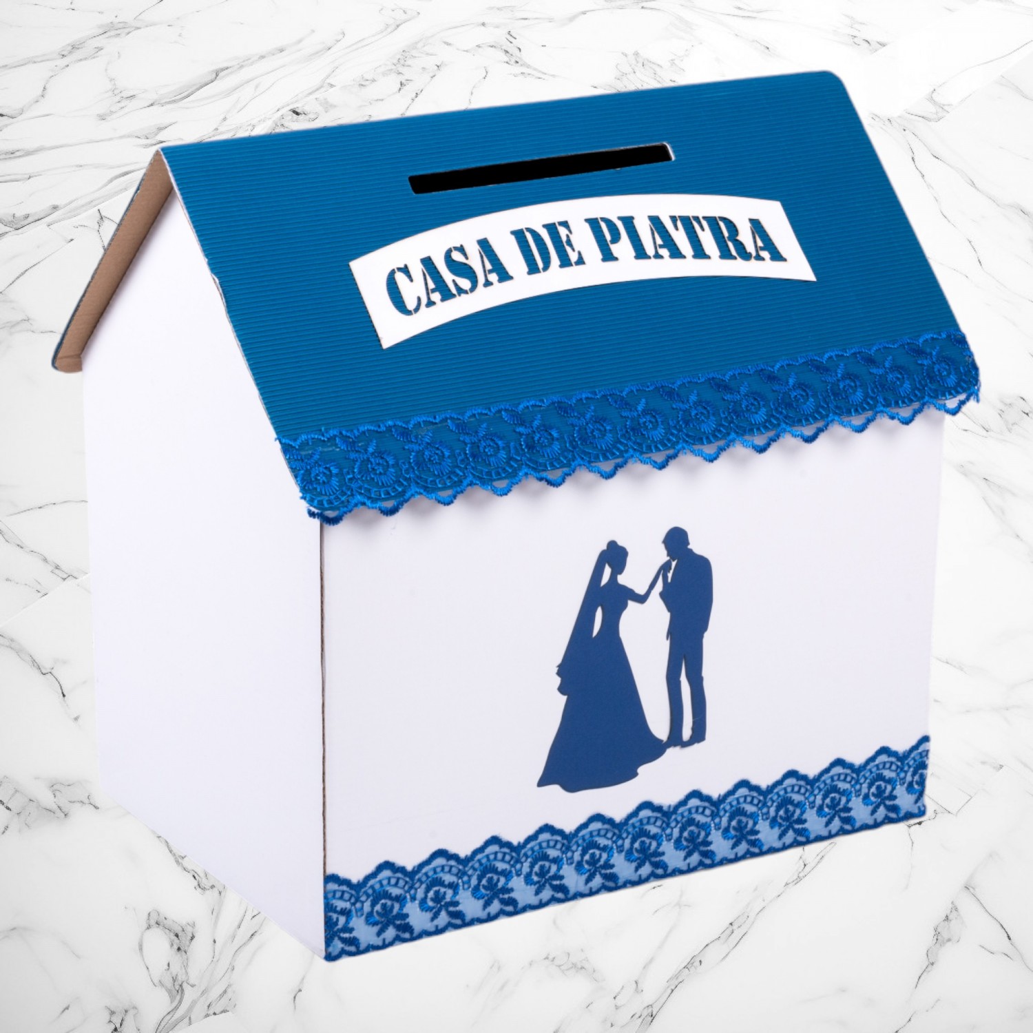 Casuta are acoperis albastru, o imagine albastra cu mirii si este decorata cu dantela in aceeasi nuanta.