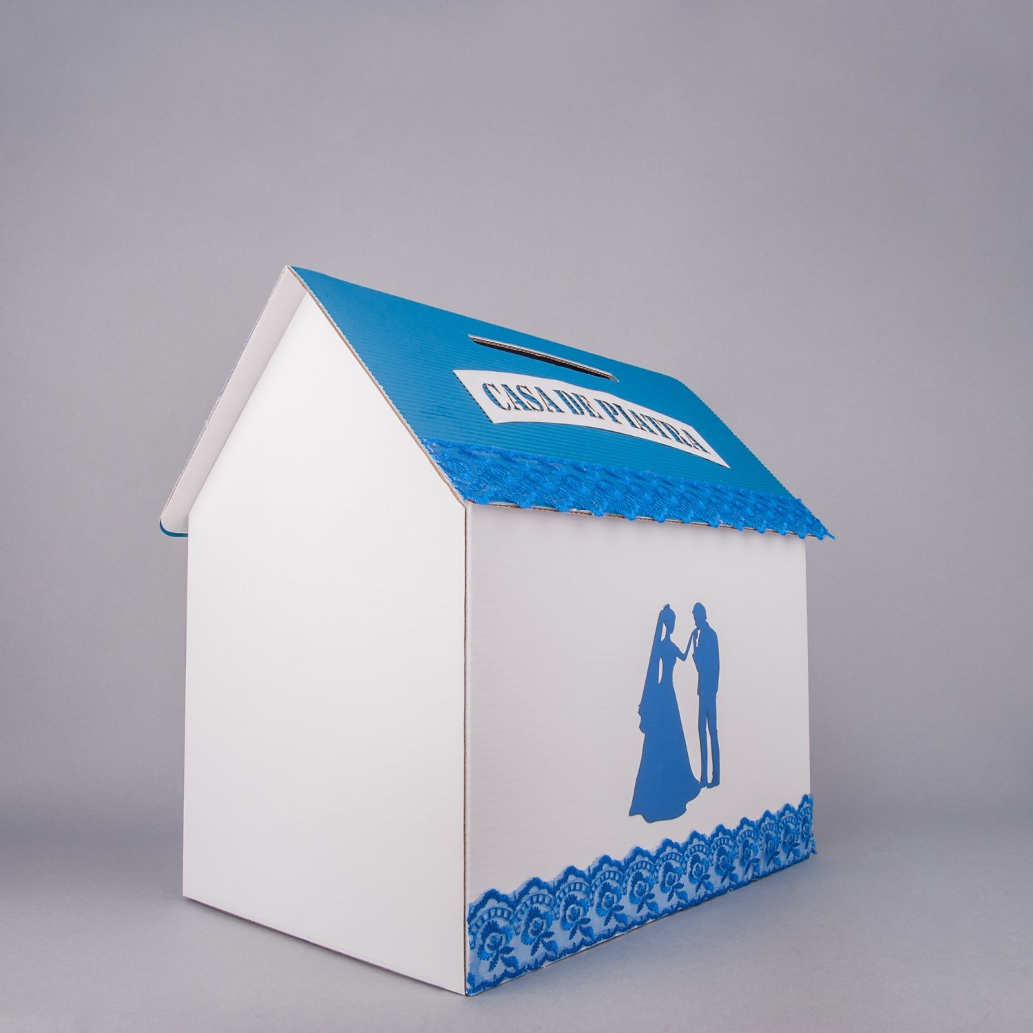 Cutia de dar nunta in forma de casuta, realizata din carton rezistent este ideala pentru strangerea banilor primiti la petrecere.