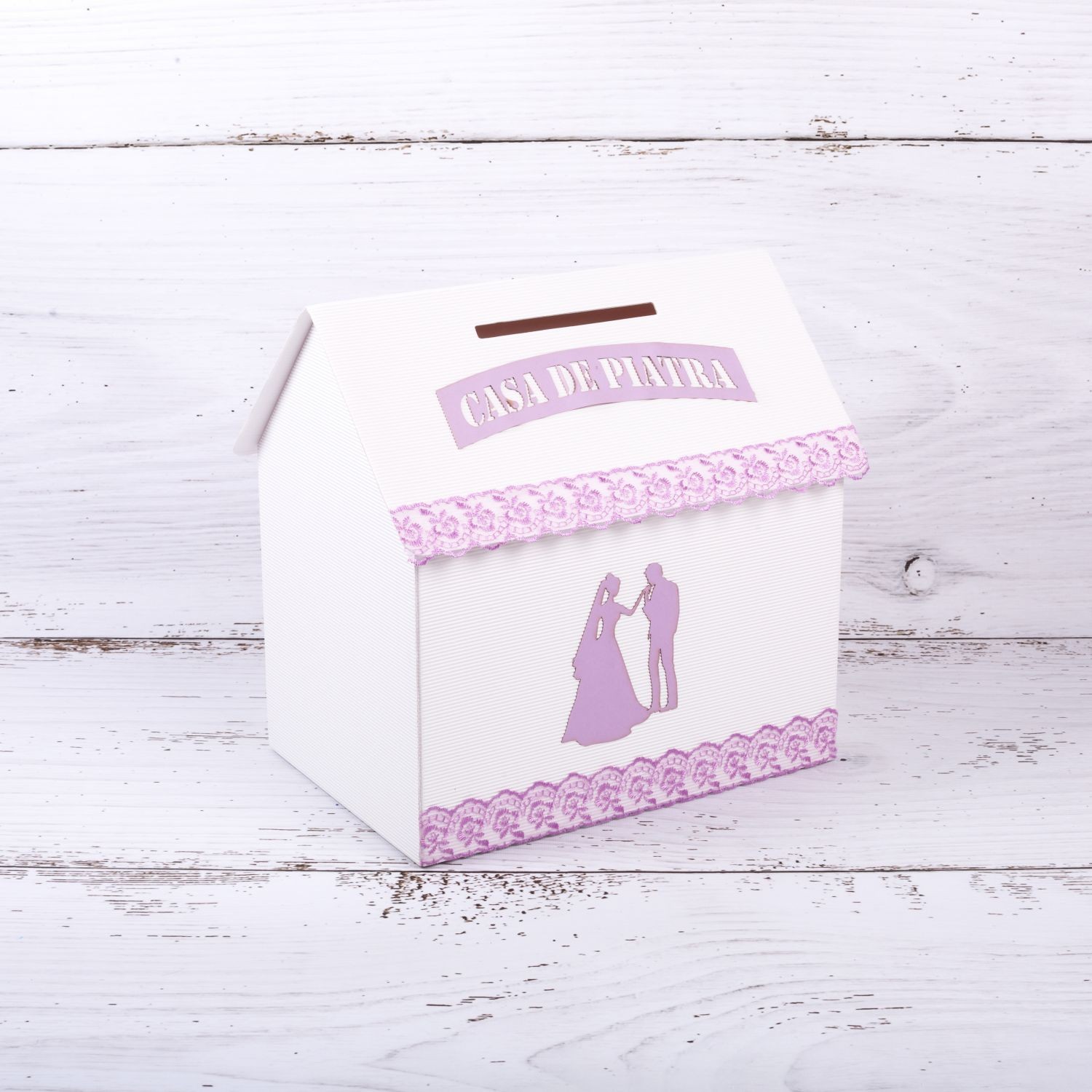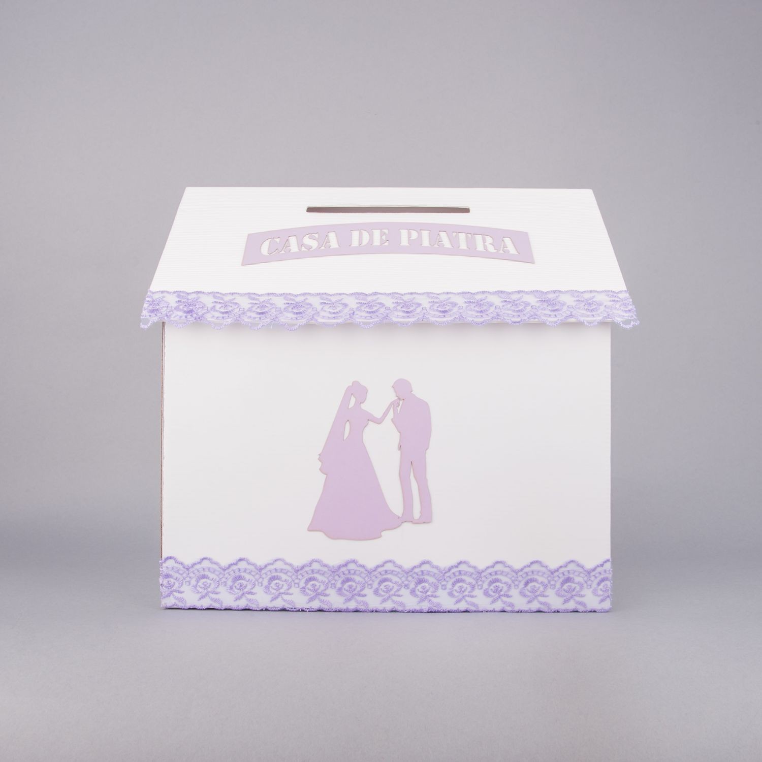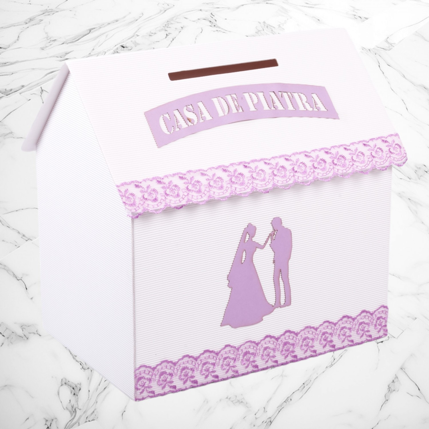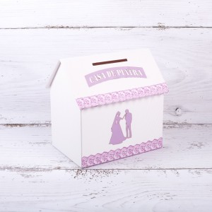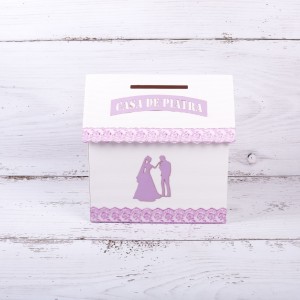 Casuta de dar nunta lila este un accesoriu elegant, ideal de folosit in cadrul receptiei pentru strangerea plicurlor de bani.