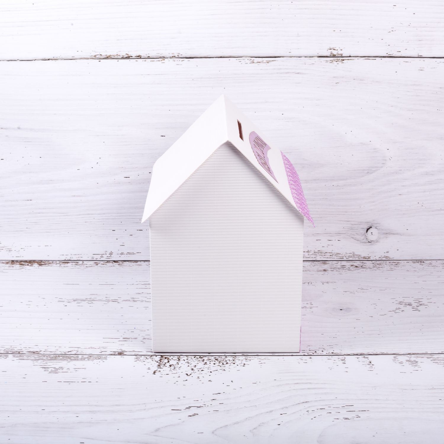 Casuta este confectionata din carton rezistent. Aceasta are acoperisul in nuante linistitoare de lila si baza casutei in alb.
