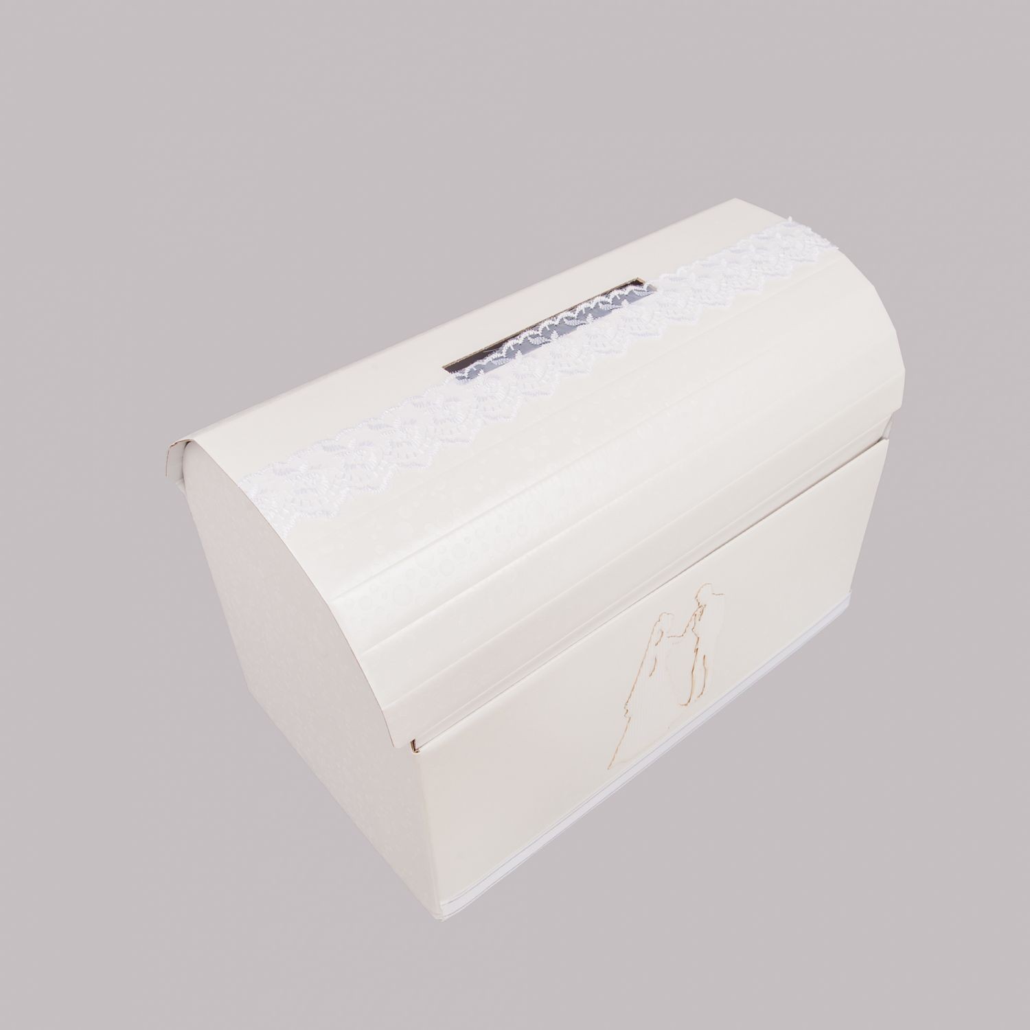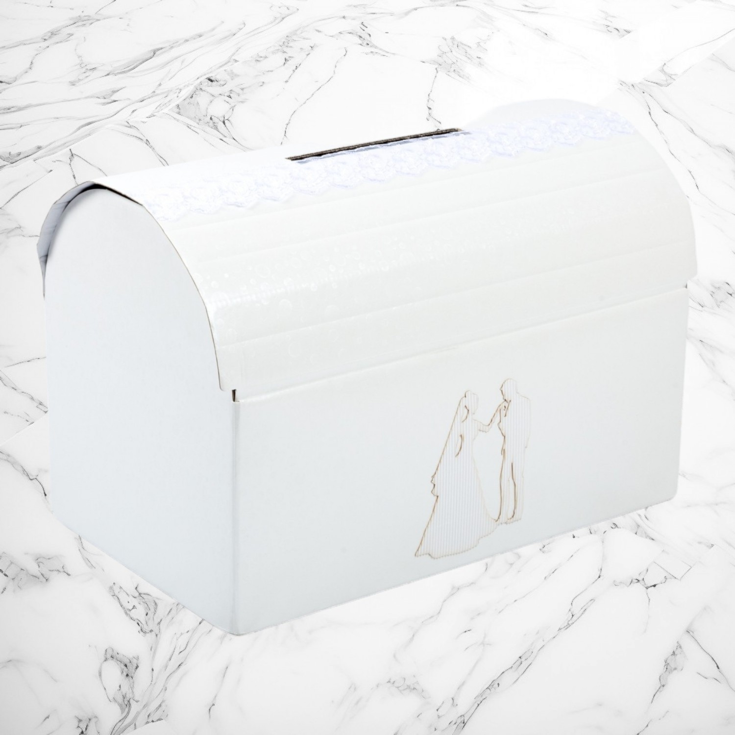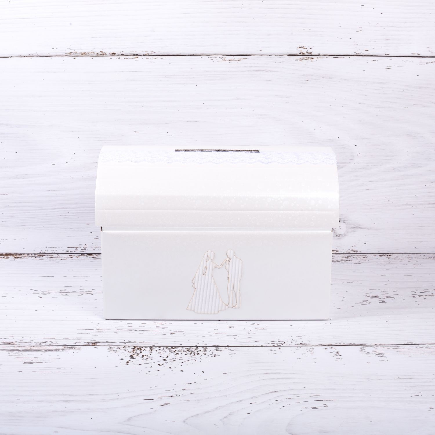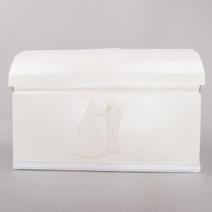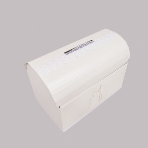 Cufarul dar nunta are un design simplu, dar atractiv si este decorat deasupra cu dantela alba.