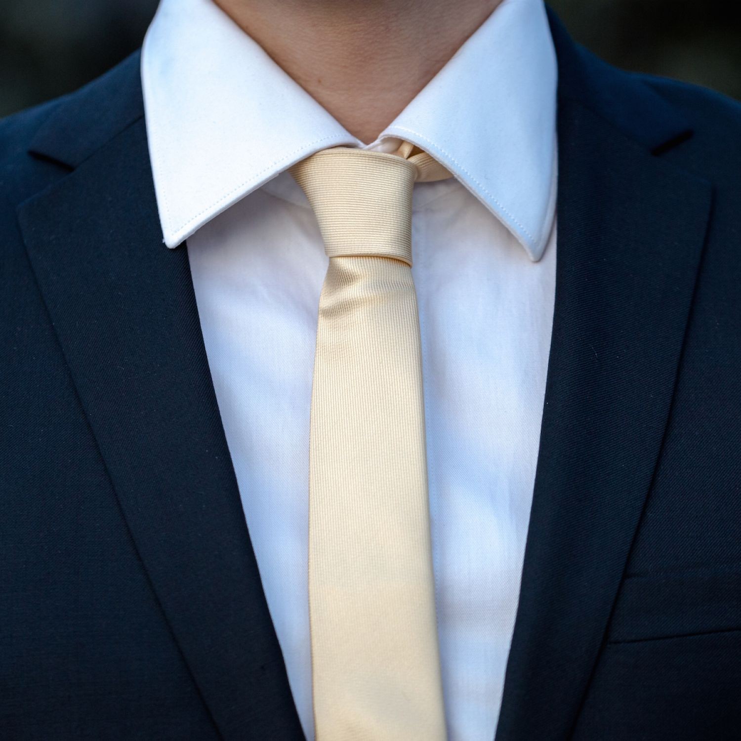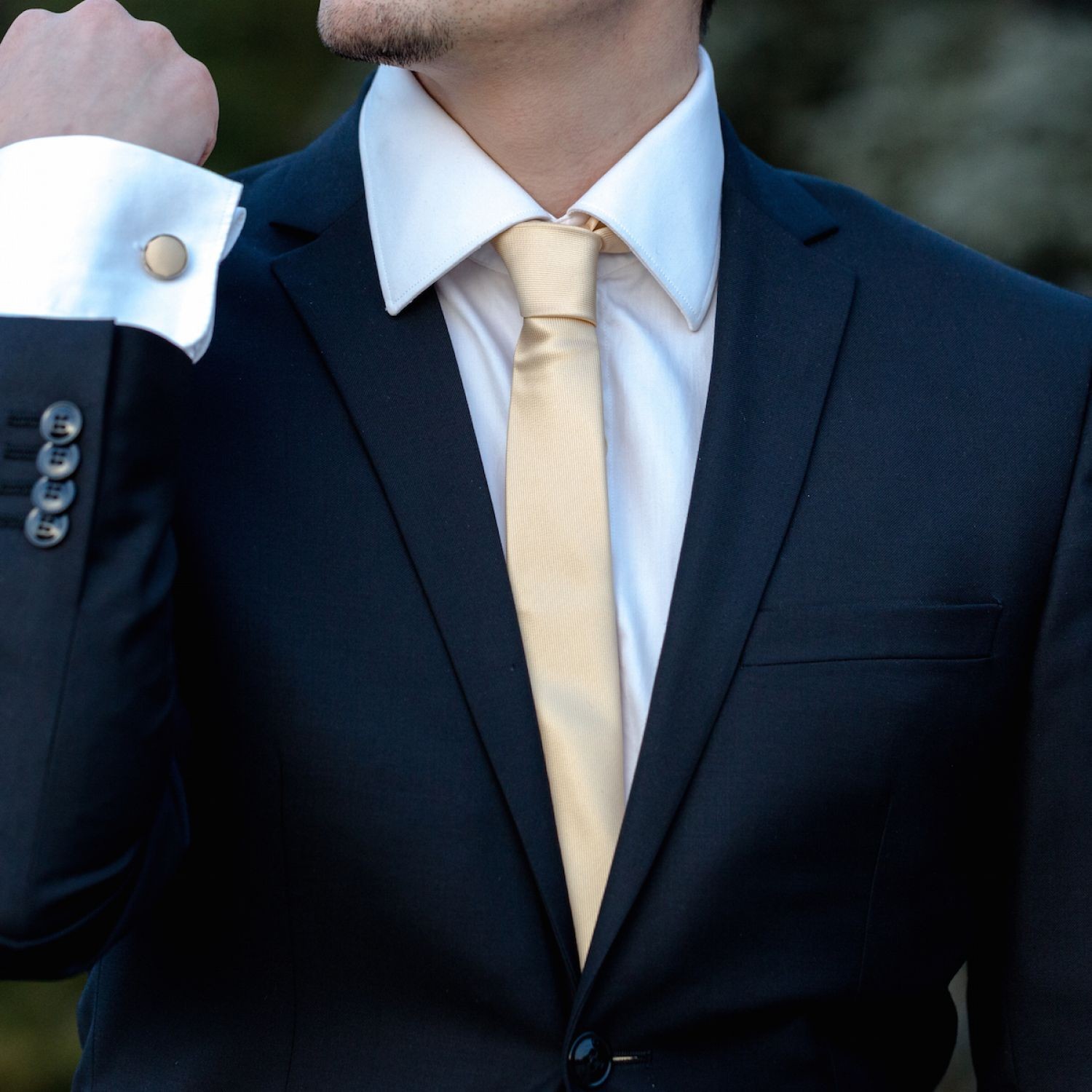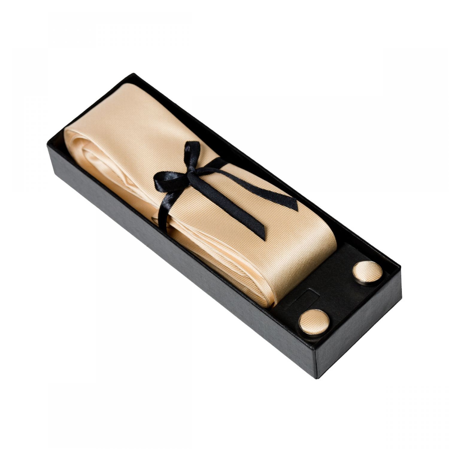 Oricand esti invitat la un eveniment elegant sau urmeaza sa imbraci tu insuti costumul de mire, asorteaza la costumul de gala pe care il porti un set de accesorii crem, format din cravata slim si butoni.