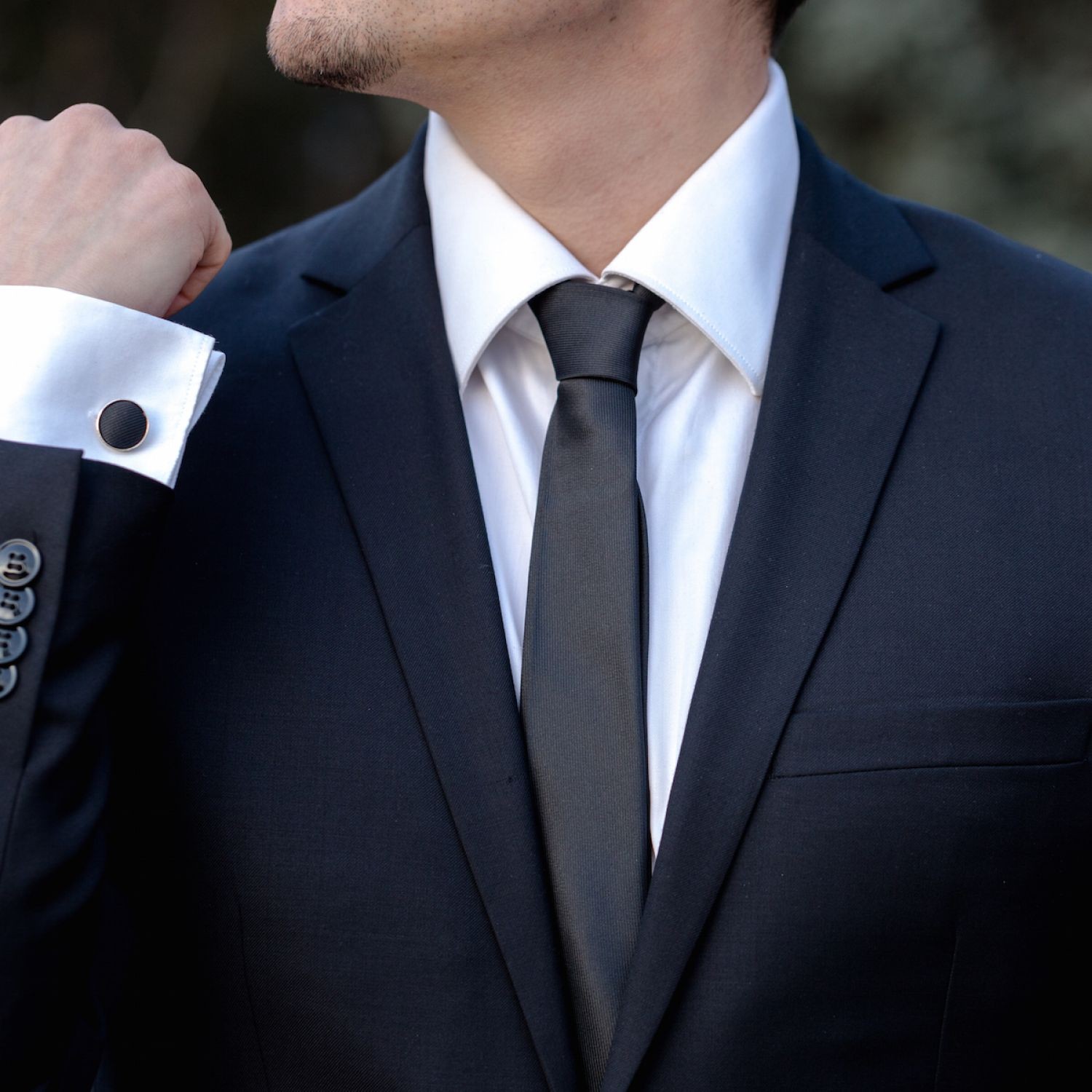 In acest sens, un set format din cravata si butoni camasa de culoare neagra este alegerea perfecta pentru mirele clasic.