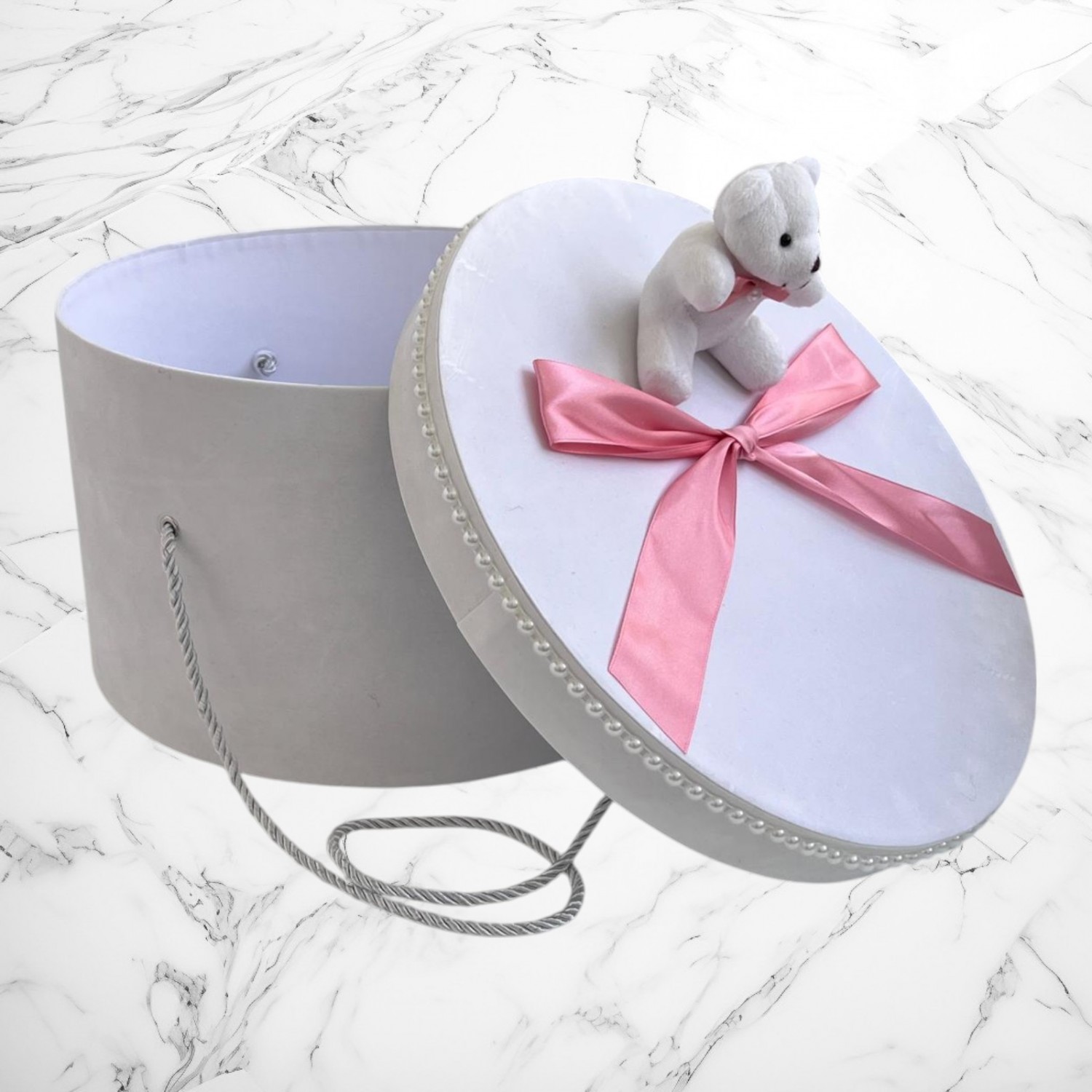 Comanda acum produsul "Cutie trusou botez ursulet si funda roz pudra".