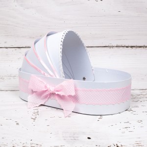 Aceasta cutie alba din carton este decorata manual cu banda roz cu buline albe si fundita asortata. Dupa botez, parintii micutei pot pastra in cutie o parte dintre amintirile de la eveniment.