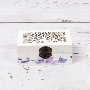 O nunta in culorile primaverii va fi mai frumoasa daca mireasa pune accent pe detalii si alege un accesoriu amintire, cum este cutiuta verighete nunta cu decor lavanda si fundita asortata.