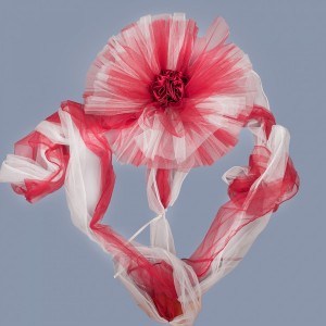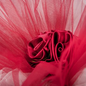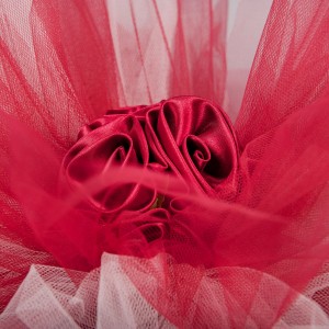 Acest decor masina din tulle in nuante de grena si alb cu buchet de trandafiri din satin in mijloc este potrivit pentru masina miresei.