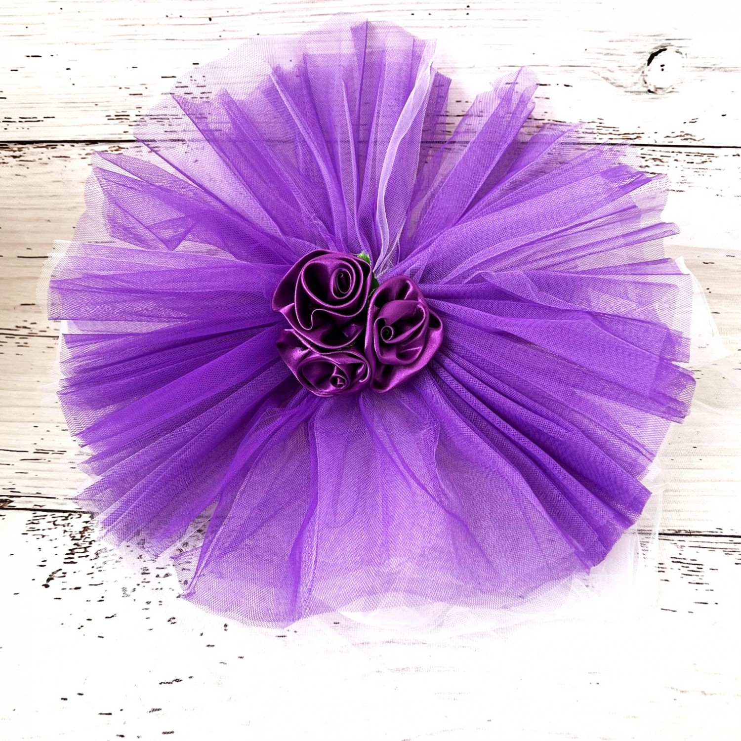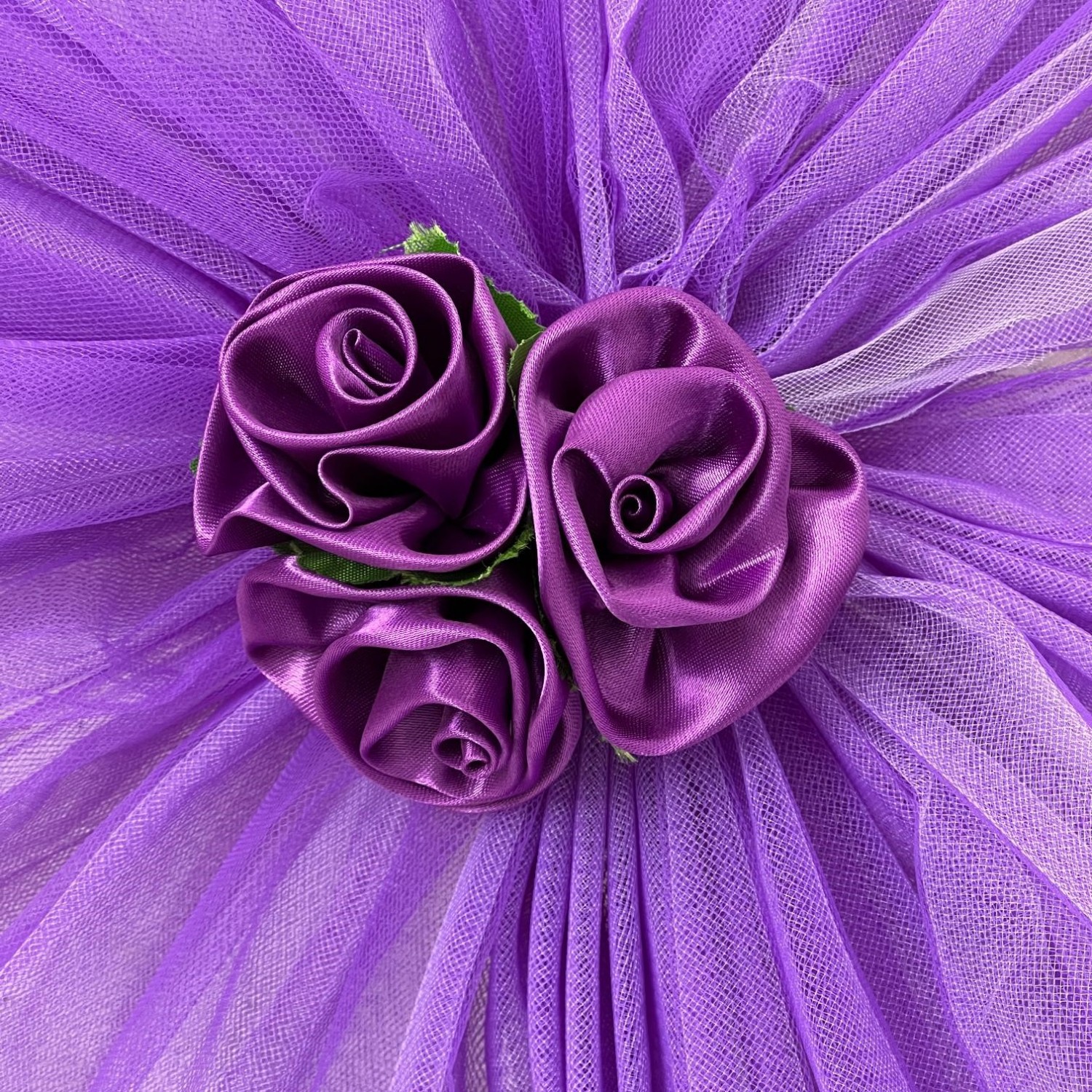 Decorul din tulle in nuante de mov si alb cu buchetel din trandafiri satinati in mijloc se foloseste adesea la nunta, pentru a da o nota festiva masinilor care ii conduc pe miri si pe invitatii lor spre biserica, dar si spre restaurant.