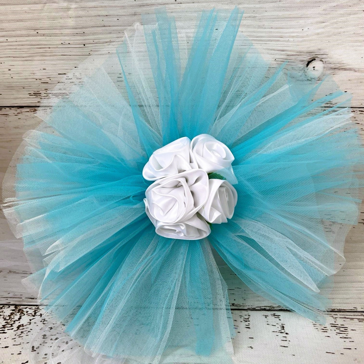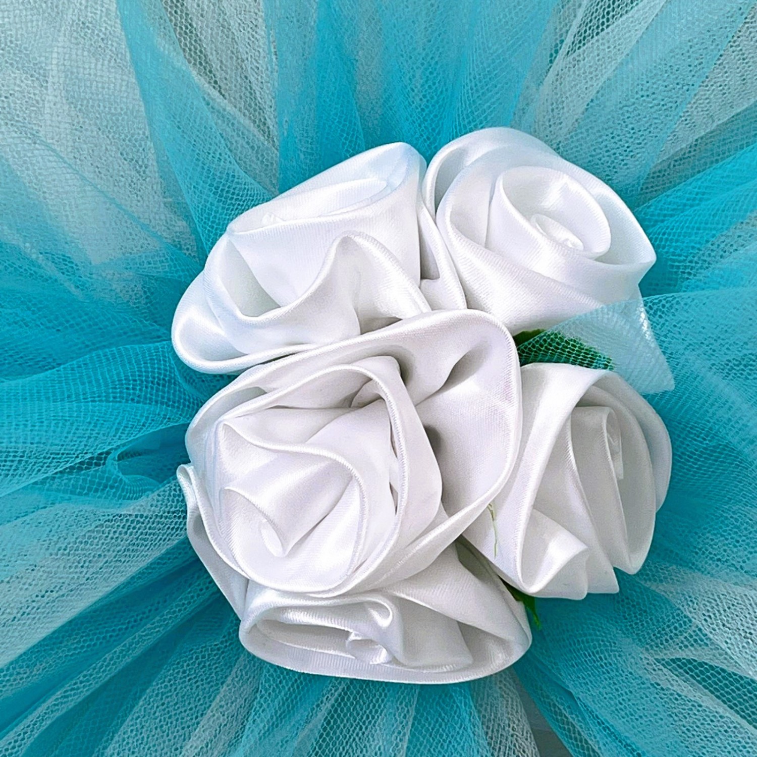 Pentru o nunta in stil traditional, dar si pentru o mireasa conservatoare care poarta rochie alba, masina principalei protagoniste din peisajul nuntii poate fi gatita cu decor din tulle si trandafiri turcoaz.