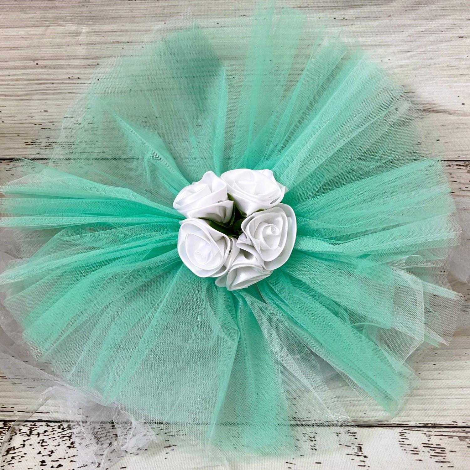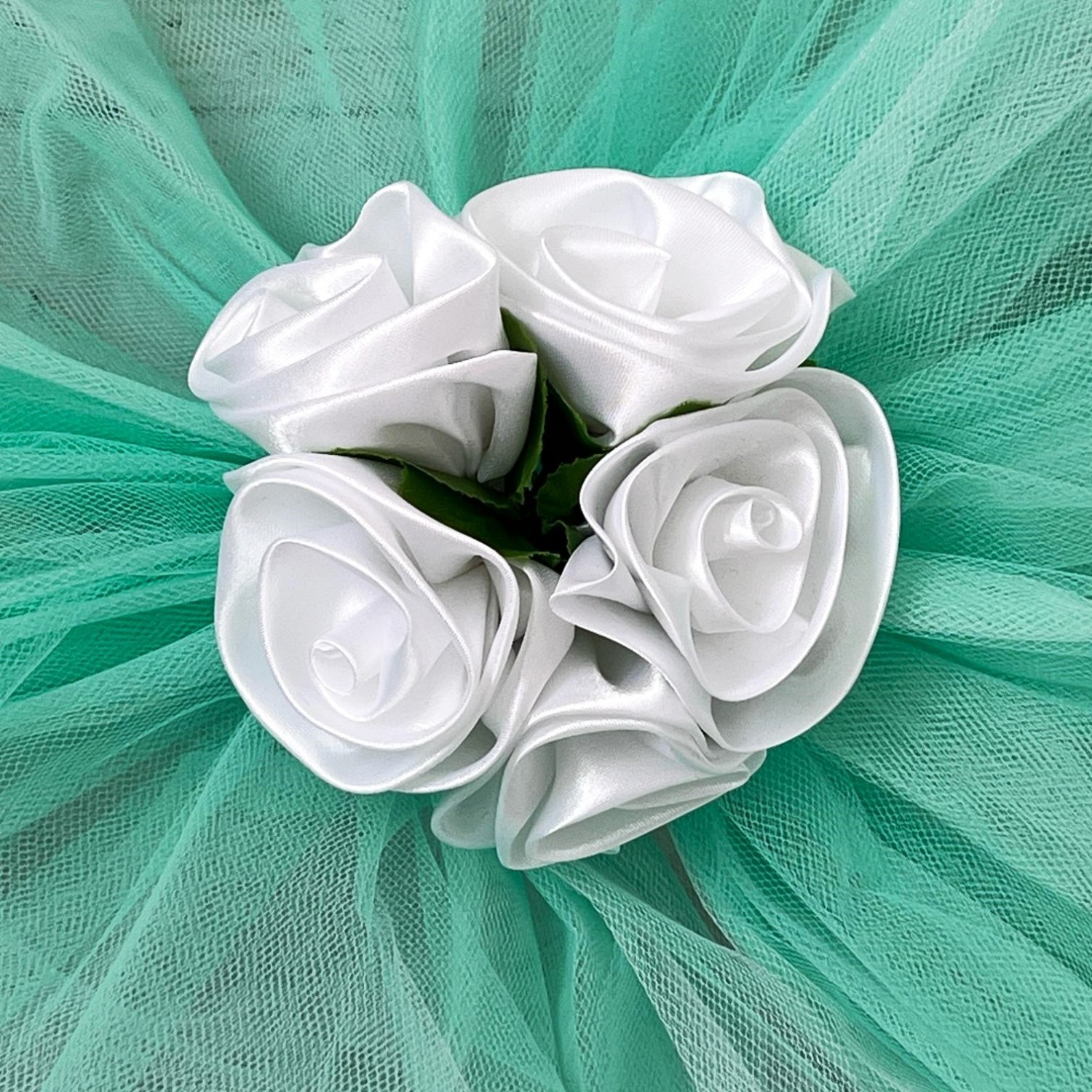 Fiecare brat din tulle care se leaga de oglinzi masoara 190 cm. Acest ornament auto se fixeaza cu ajutorul unor snururi subtiri, cusute de tulle.