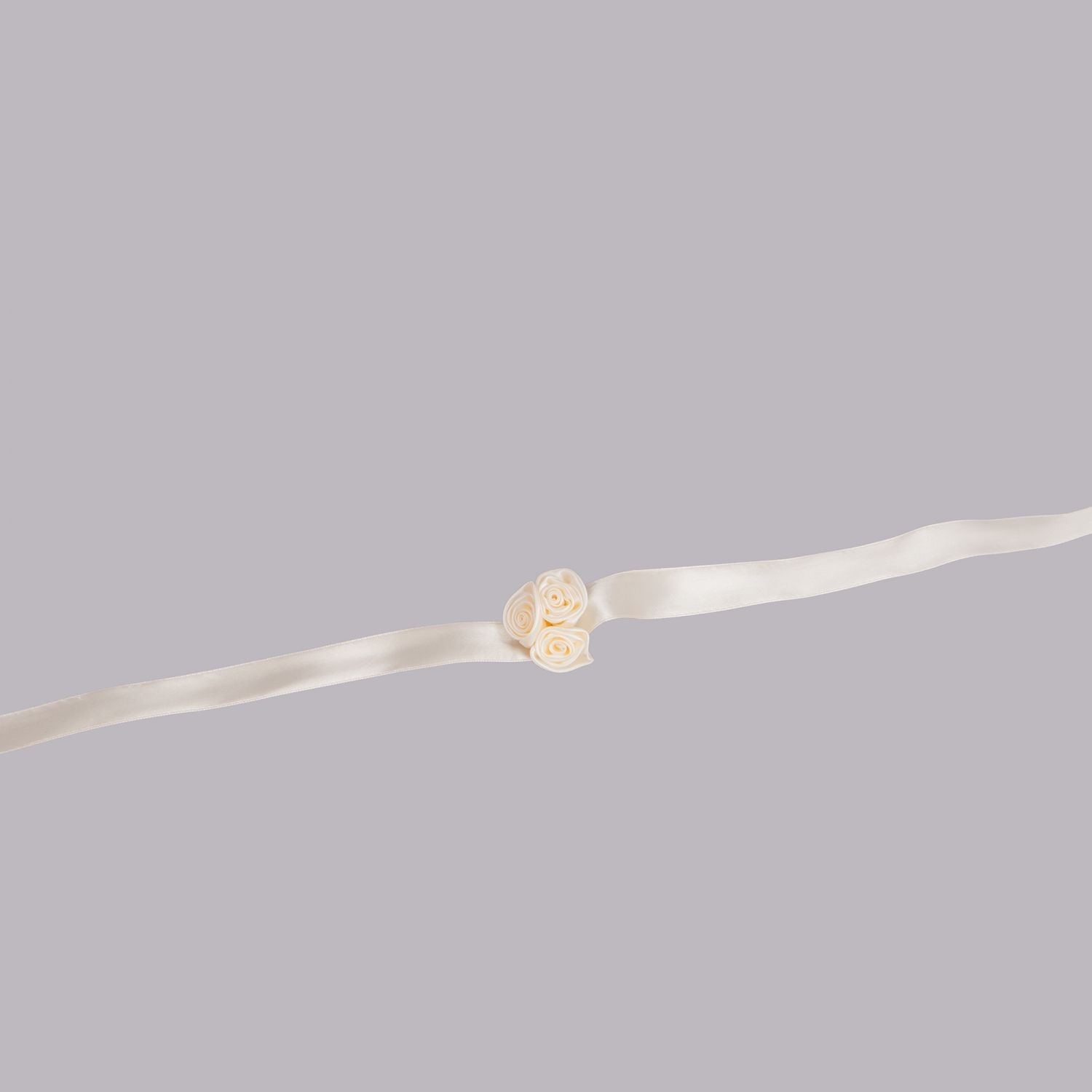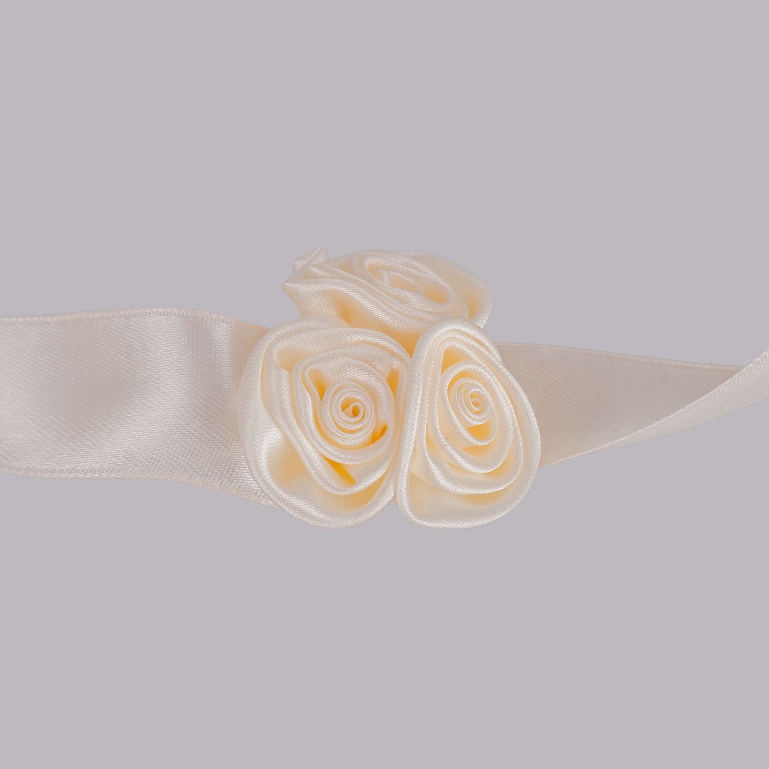 Corsaj handmade pentru incheietura mainii format dintr-o panglica din satin ivory, lunga de 49 cm si trei trandafirasi in aceeasi culoare.