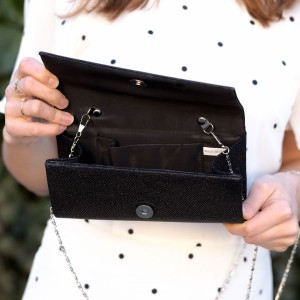 Plicul de ocazie negru are un singur compartiment in care poti pastra obiectele personale.