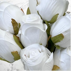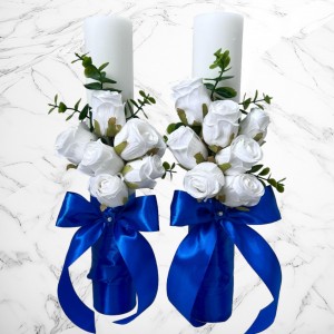 Aceste lumanari sunt decorte cu trandafiri artificiali albi si fundita albastra.