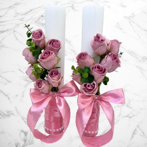 Aceste lumanari sunt decorte cu trandafiri artificiali roz pudra si fundita roz pudra.