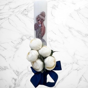 Aceste lumanari sunt decorte cu bujori artificiali albi si fundita bleumarin si neagra.