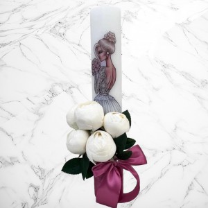 Aceste lumanari sunt decorte cu bujori artificiali albi si fundita roz pudra si neagra.