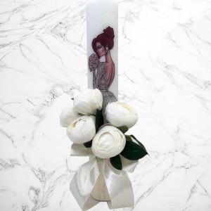 Aceste lumanari sunt decorte cu bujori artificiali albi si fundita ivory si neagra.