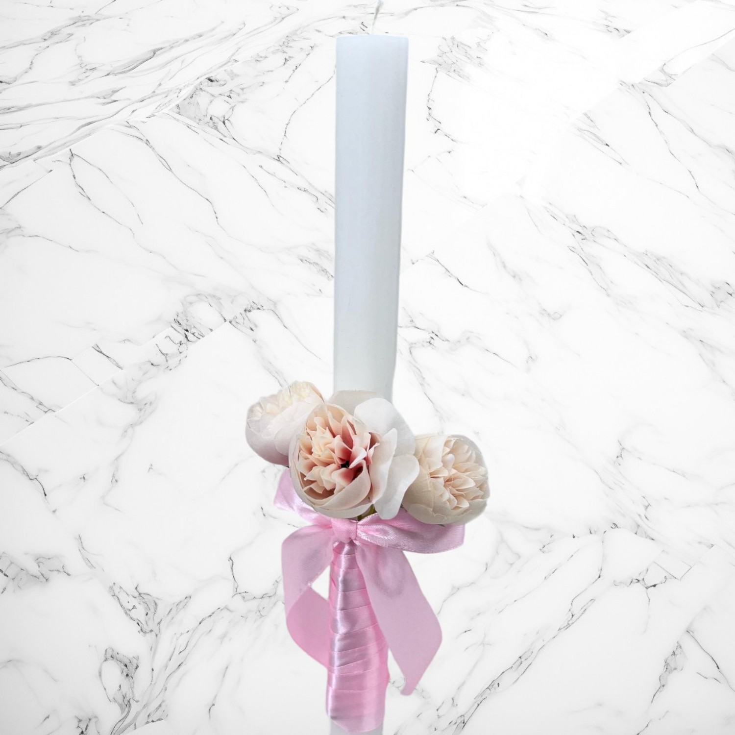 Lumanarea este decorata din flori artificiale bujori si este decorata cu fundita de culoare roz.