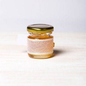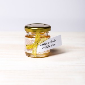 Marturiile borcanele miere cu fundita aurie si dantela cu fir auriu sunt o alegere ideala pentru evenimentele care au in prim plan decorul auriu.