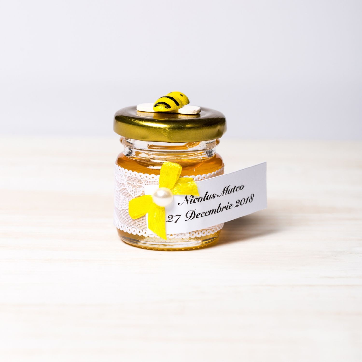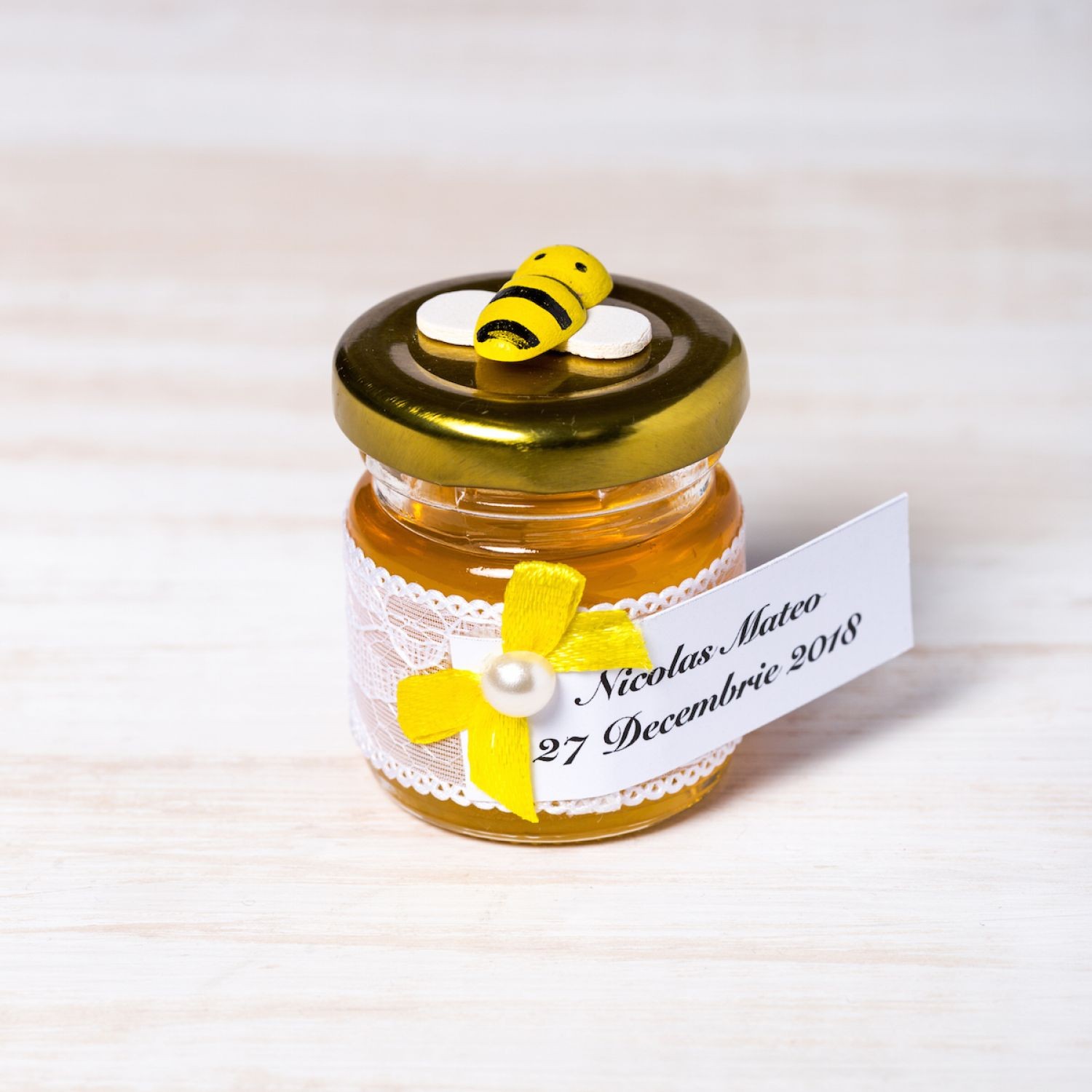 Fie ca nunta voastra este programata in plina vara sau toamna, cand se culeg roadele campului, daca evenimentul este unul rustic sau traditional, cel mai bun cadou pentru invitati sunt marturiile borcanele miere cu dantela alba, fundita galbena si albinuta pe capac.