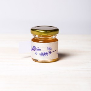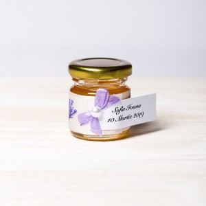 Pentru o petrecere de botez cu mireasma imbietoare de lavanda, parintii unei fetite dragalase pot oferi invitatilor in dar borcanele miere decorate festiv cu model lavanda si fundita lila.