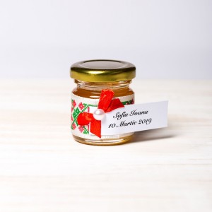 Marturiile borcanele miere se ofera personalizate cu eticheta. Pe eticheta se imprima numele fetitei sau baietelului tau si data evenimentului.