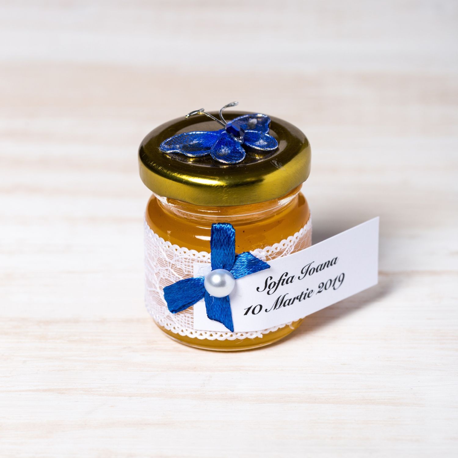 Ofera la prima petrecere importanta din viata ingerasului tau celor prezenti la eveniment marturii borcanele umplute cu miere, decorate festiv cu o banda alba din dantela, fundita albastra cu perluta asortata in mijloc si un fluture dragalas pe capac.