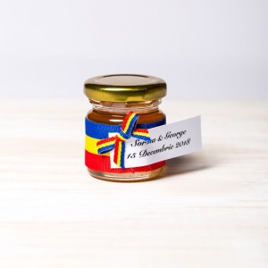 Marturiile borcanele miere cu banda in trei culori (rosu, galben si albastru) reprezinta un cadou deosebit, ce lasa o impresie puternica asupra invitatilor. Marturiile au fundita tricolor.