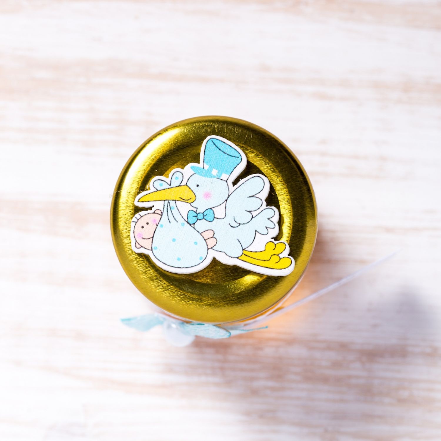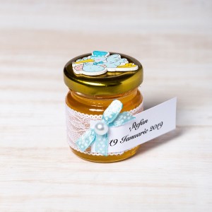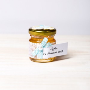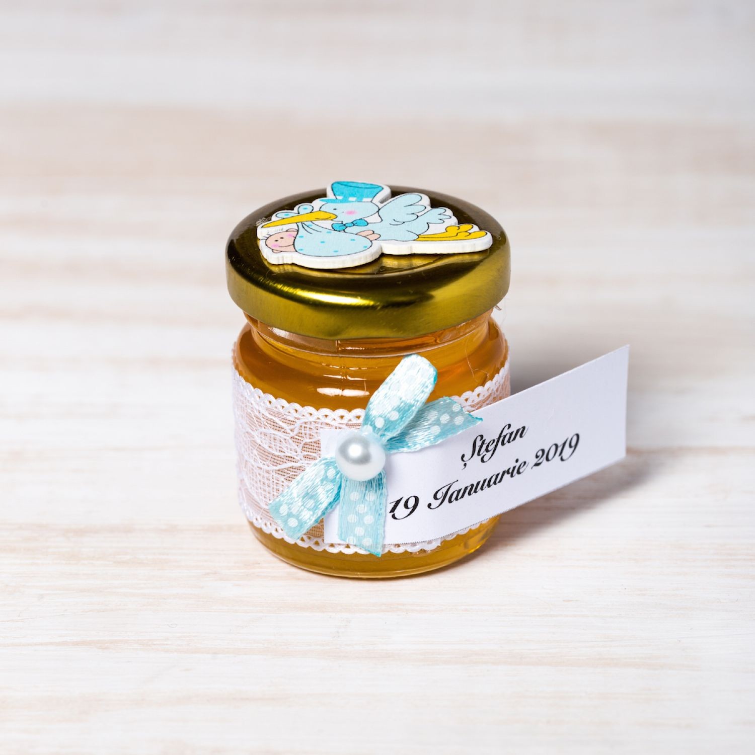 Daca vrei sa iti impresionezi invitatii la botezul baietelului tau cu cadouri creative, alege marturii borcanele miere decorate festiv cu dantela alba, fundita bleu cu buline, perluta si figurina barza bleu lipita pe capac.