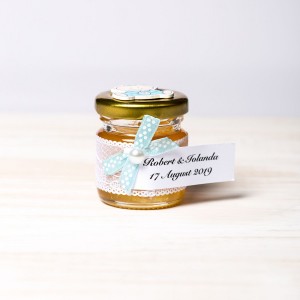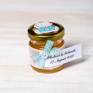 Daca a venit momentul sa alegi marturii botez pentru primul eveniment important din viata baietelului tau, alege cadouri dulci cu decor amuzant, cum sunt borcanelele miere cu figurina bebelus imbracat in pijama bleu, care isi consuma ultimul biberon de lapte inainte de culcare.