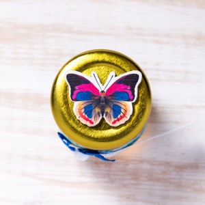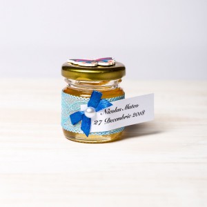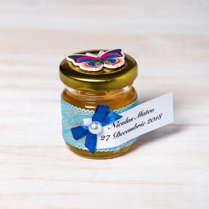 Pentru un botez elegant, parintii bebelusului pot alege marturii borcanele miere decorate festiv cu dantela bleu, fundita albastra cu perluta alba in mijloc si un fluturas multicolor lipit pe capac.