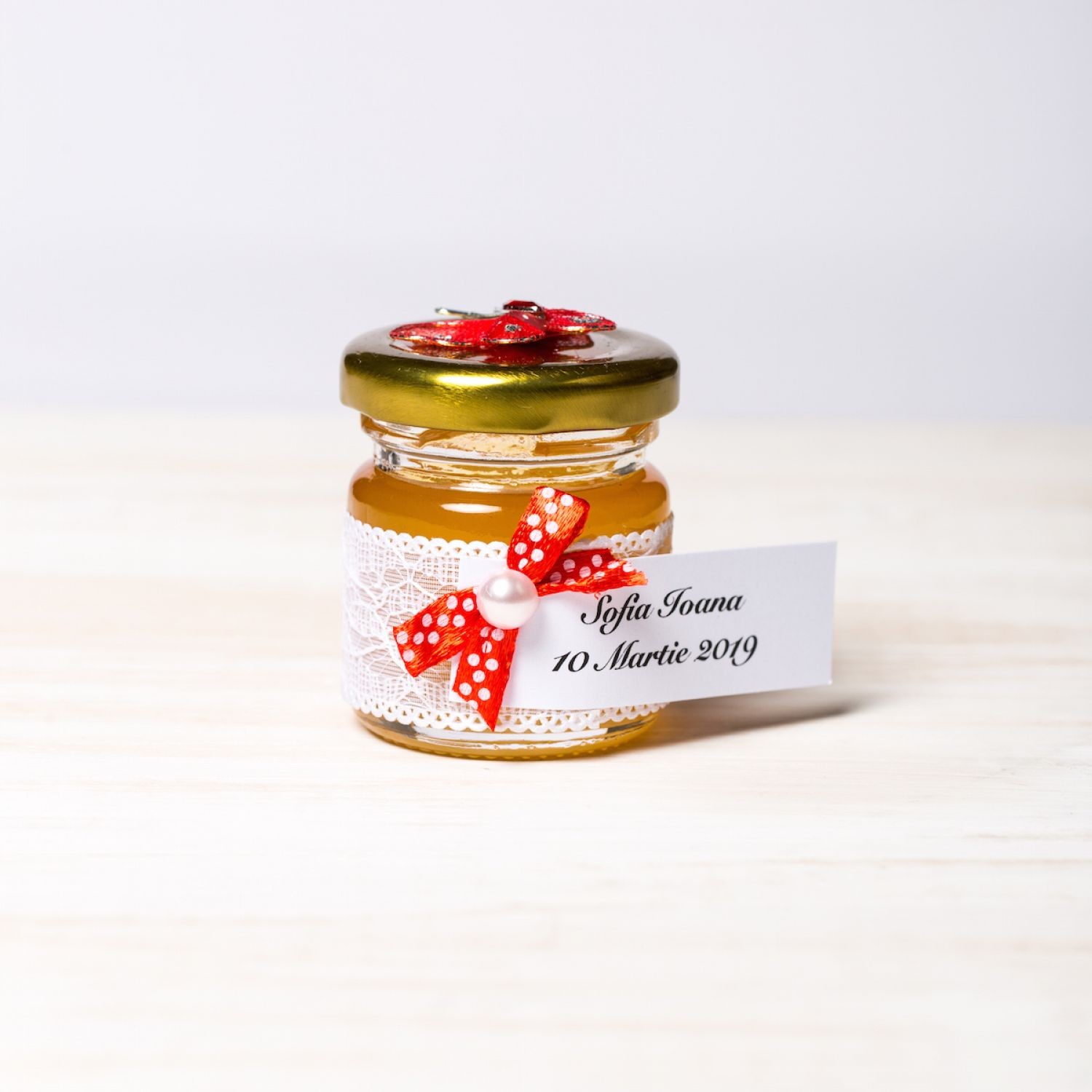 Daca vrei sa faci o surpriza frumoasa la petrecerea copilasului tau proaspat crestinat, ofera-le invitatilor prezenti la prima petrecere din viata bebelusului tau marturii botez borcanele miere cu dantela alba, fundita rosie cu buline albe si fluture rosu pe capac.